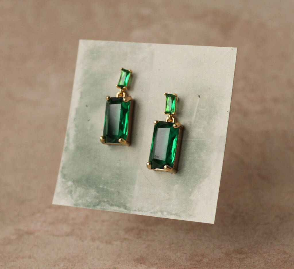 The tiny cubic zirconia jewels are cut into perfect rectangles. The baguette cut stones are glass in a beautiful, cool toned emerald green shade.