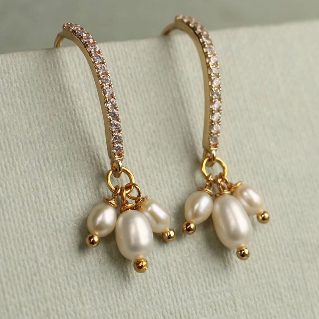 These beautifully detailed art deco earrings feature a stylised pave crystal design earhook with a trio of beautiful ivory freshwater pearls.