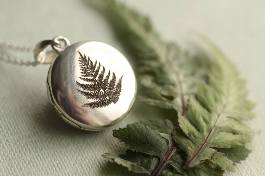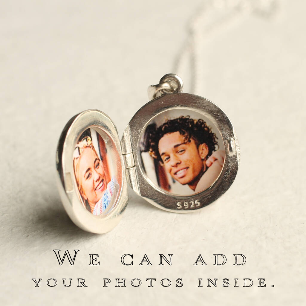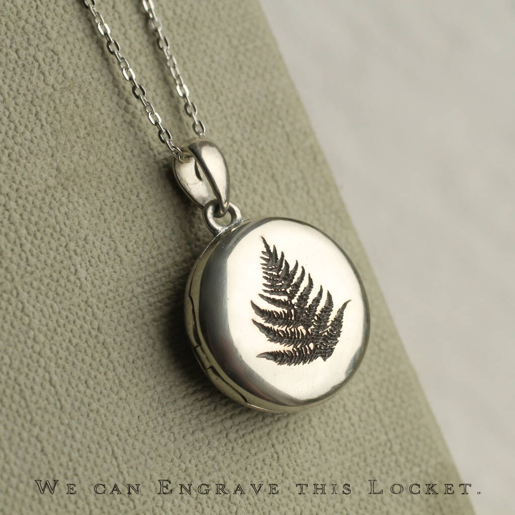 We love the simplicity of this solid 925 sterling silver personalized locket necklace. We can professionally insert your photos inside, and engrave a sweet fern design on the front, if you wish.