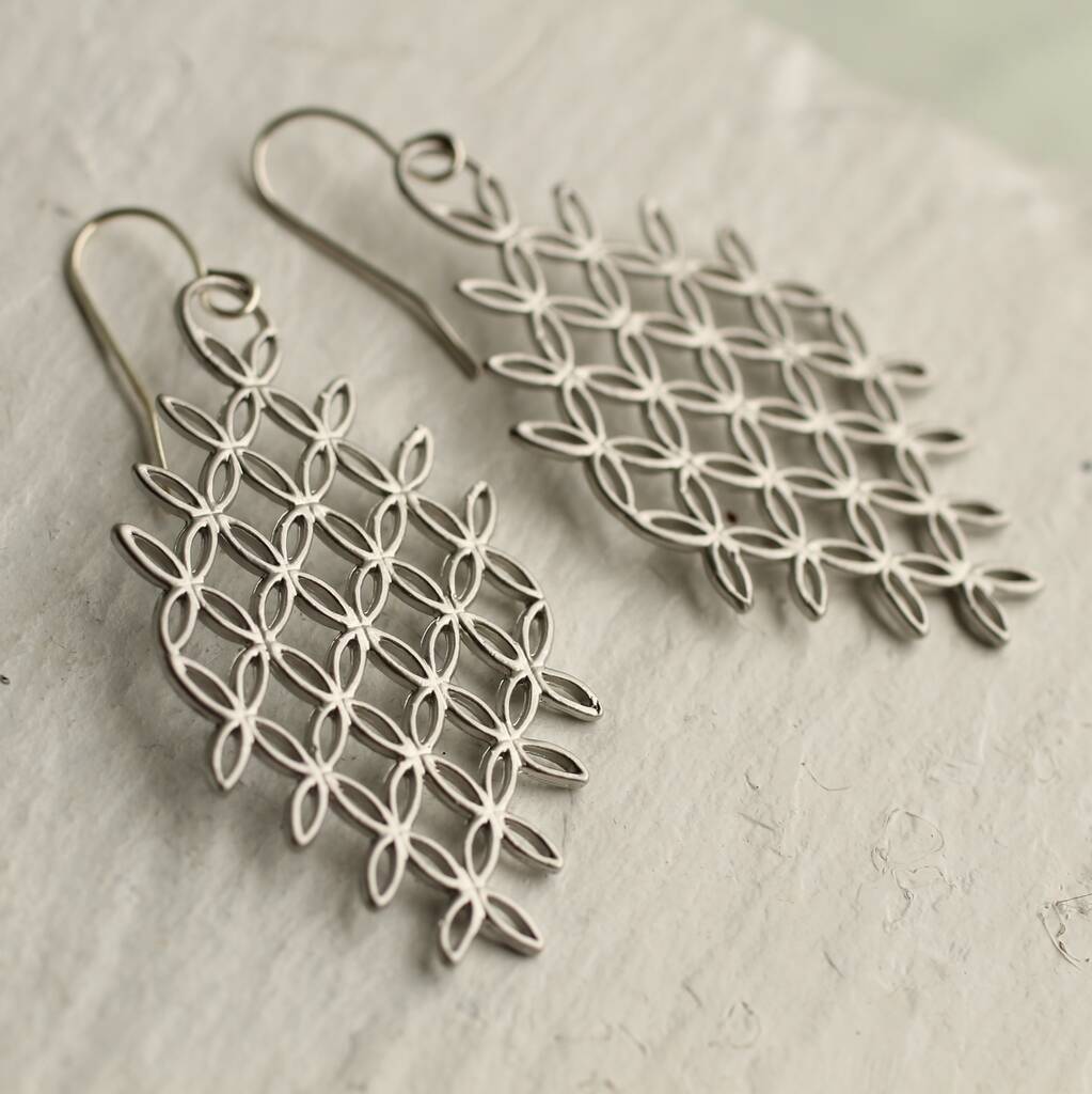 These silver art deco earrings feature a stylised petal or honeycomb design.