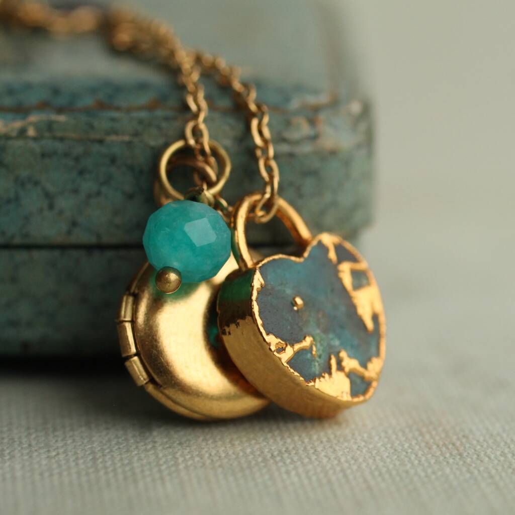 The gemstone has been electroplated around the edges and over the surface with 18ct gold, to add unique detail to the padlock. The charm hangs alongside a miniature brass photo locket and a beautiful turquoise amazonite accent bead.