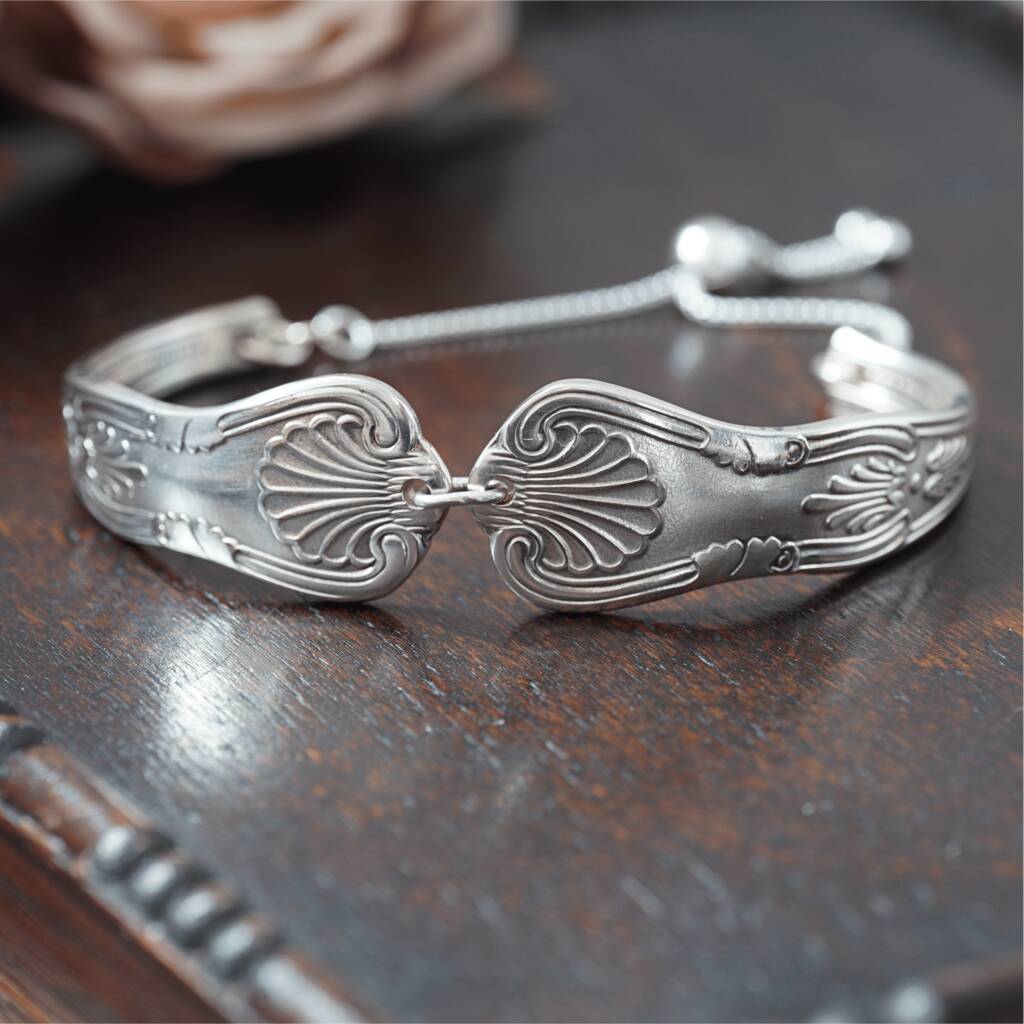 This bracelet is handcrafted from vintage spoon handles, thoughtfully reshaped and finished with an adjustable ball chain for a contemporary edge. Once part of an elegant table setting, the handles now rest gracefully along the wrist - their heritage preserved in every curve and contour.