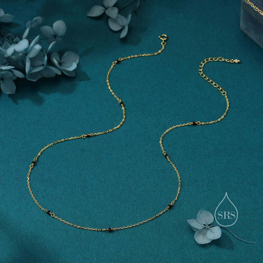 Sterling Silver 2mm Black Spinel Beaded Satellite Chain Necklace, delicate chain featuring sparkling black spinel beads, offering subtle elegance for everyday or layered looks.