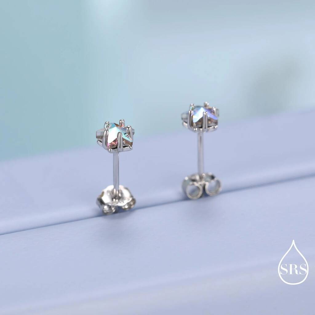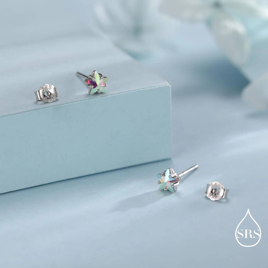 Chic handcrafted Aurora AB CZ star stud earrings. Embrace celestial charm with dazzling-colors. Perfect for adding a touch of magic or gifting for enchanting occasions.