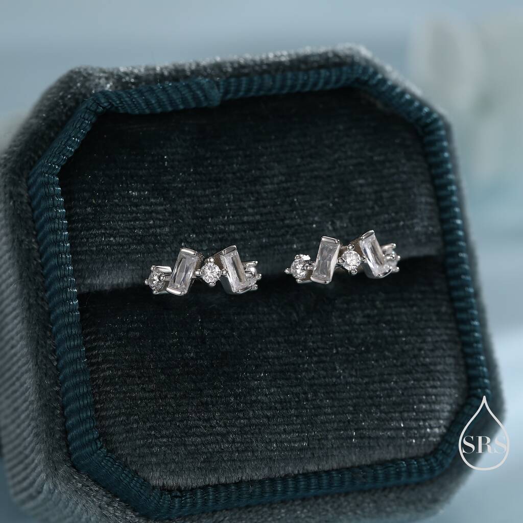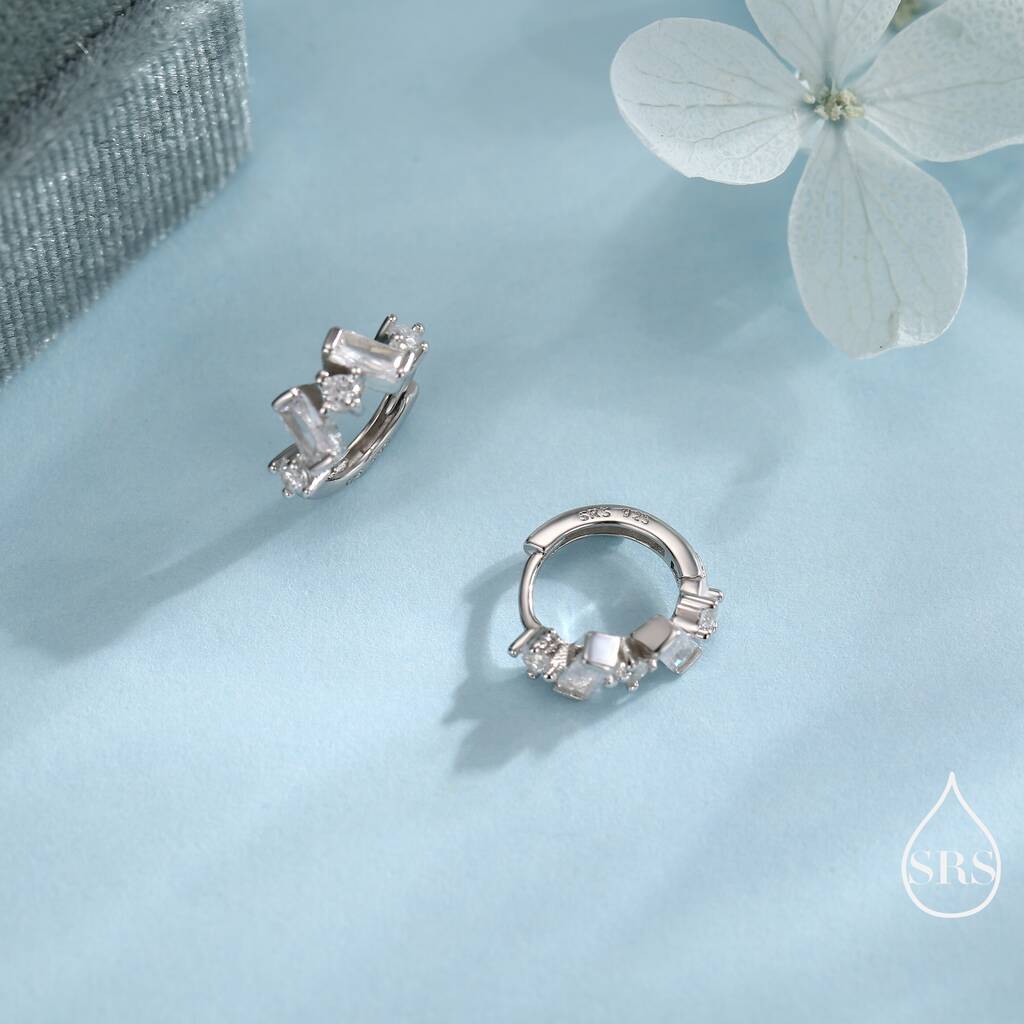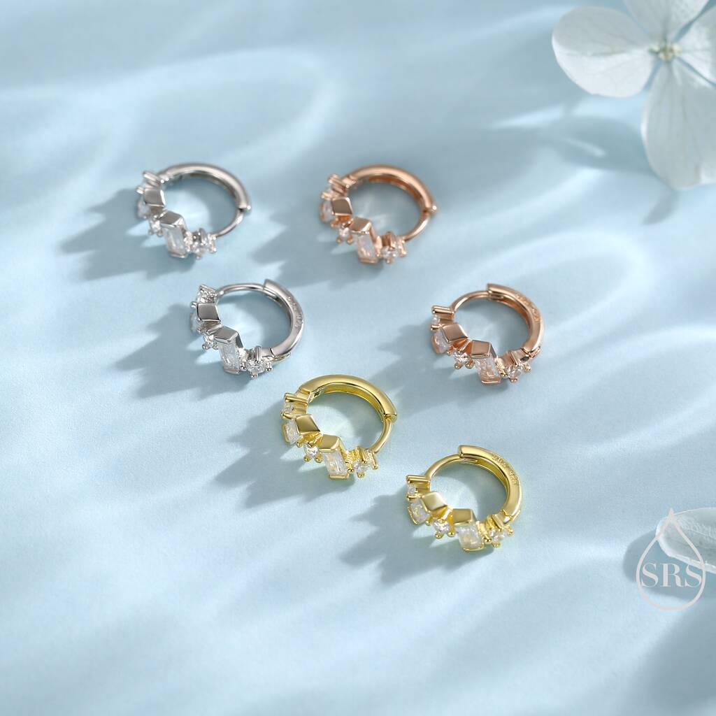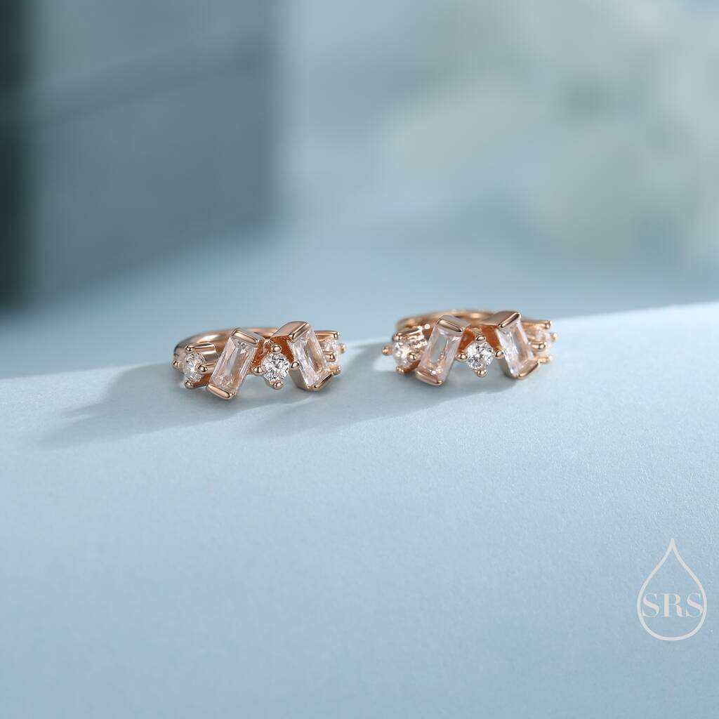 Chic baguette CZ cluster huggie hoop earrings. Elevate your elegance with these versatile huggies. Perfect for adding a touch of sparkling-allure or gifting contemporary charm.