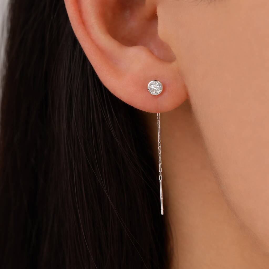 Bezel Cz Crystal Threader Earrings In Sterling Silver