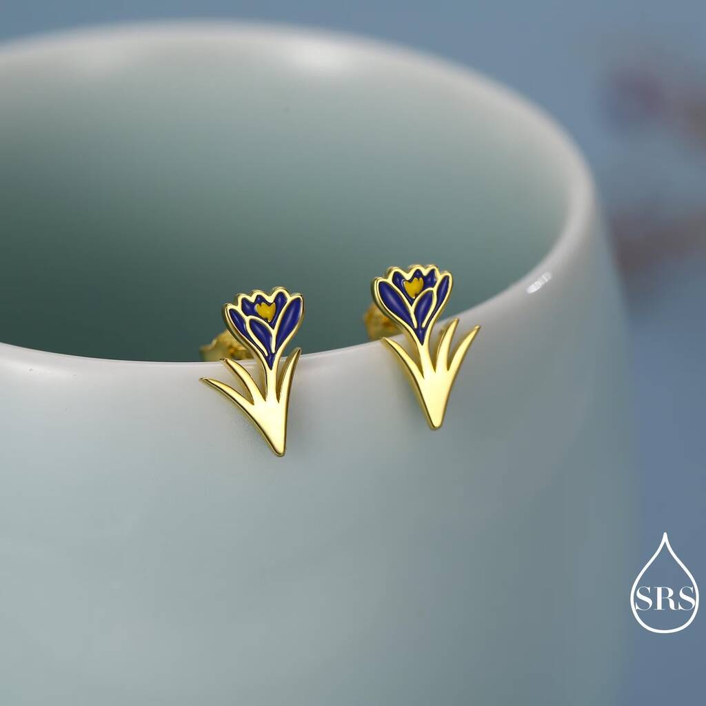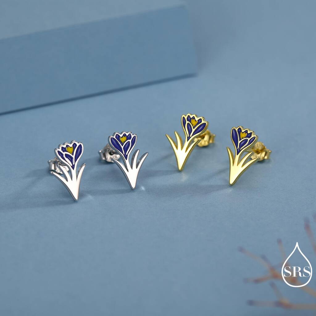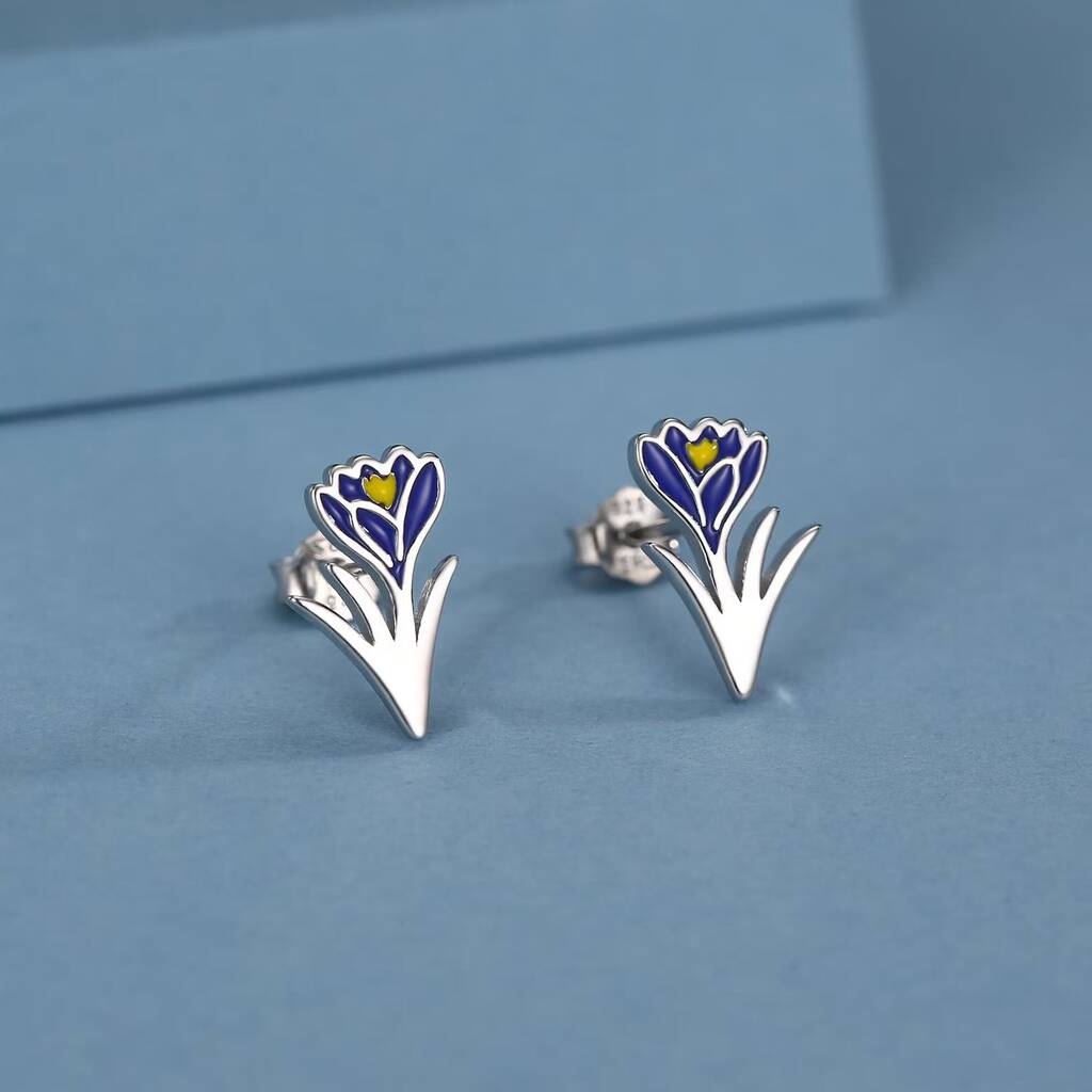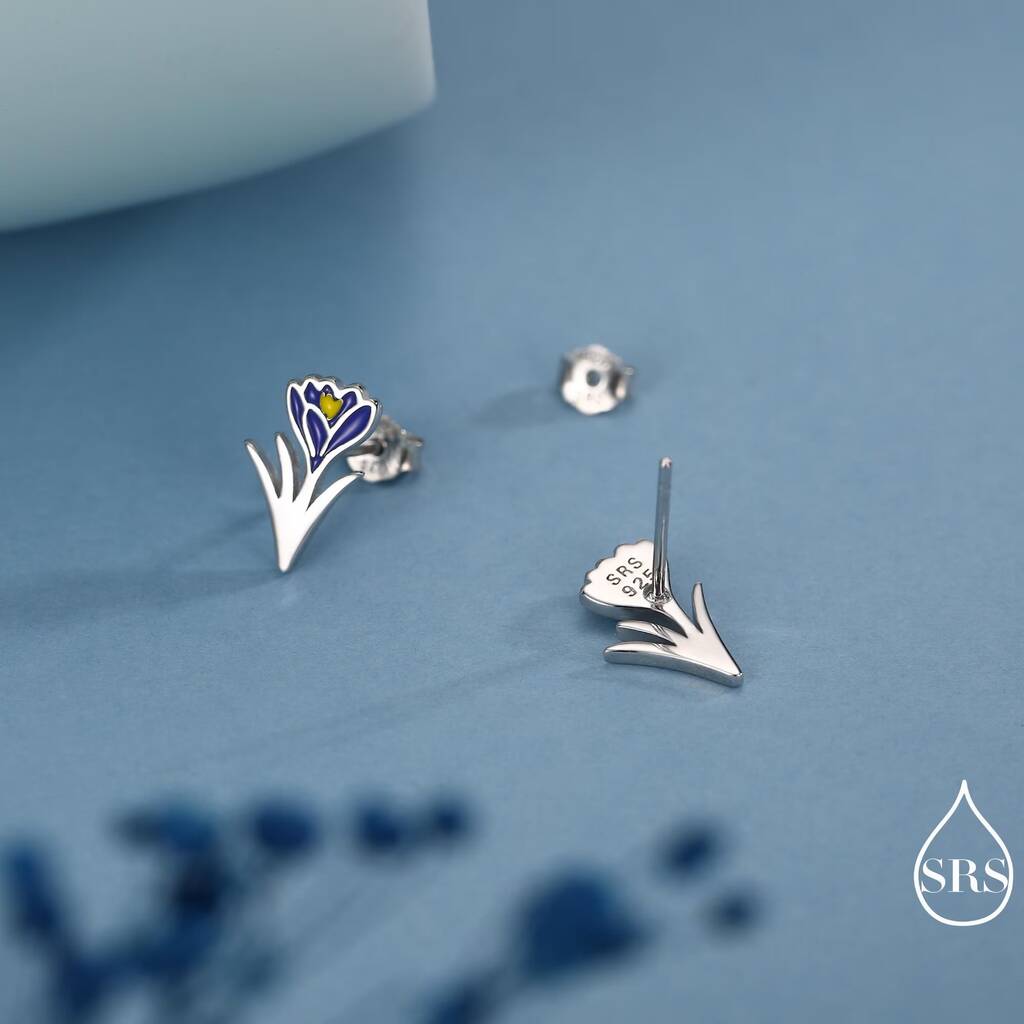 Blue Crocus Flower Stud Earrings In Sterling Silver