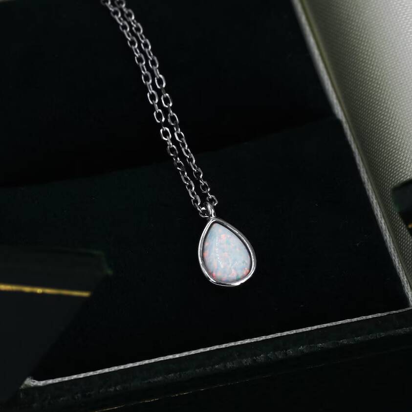 Elegant white opal droplet pendant necklace in sterling-silver. Radiate with iridescent allure. Ideal for adding a touch of enchantment or gifting luminous charm.