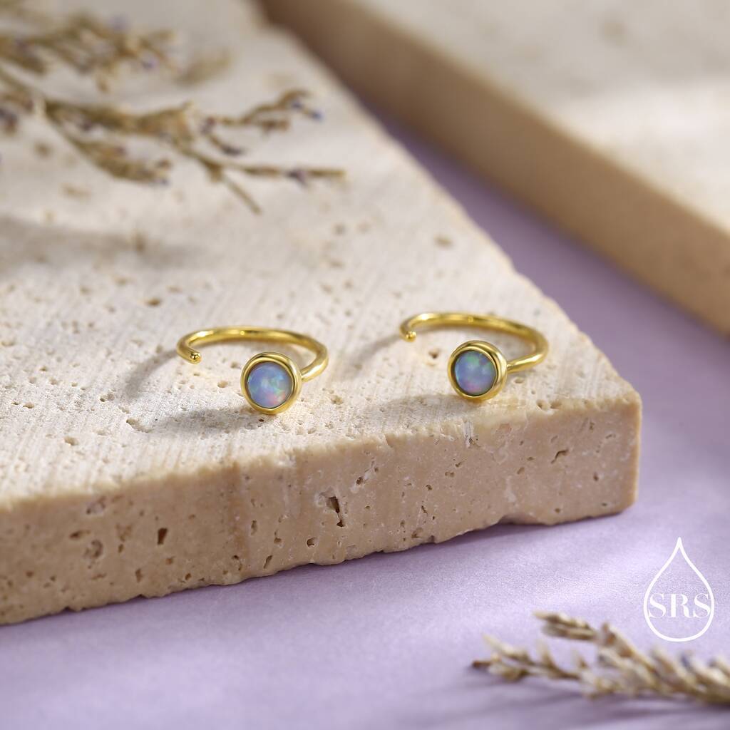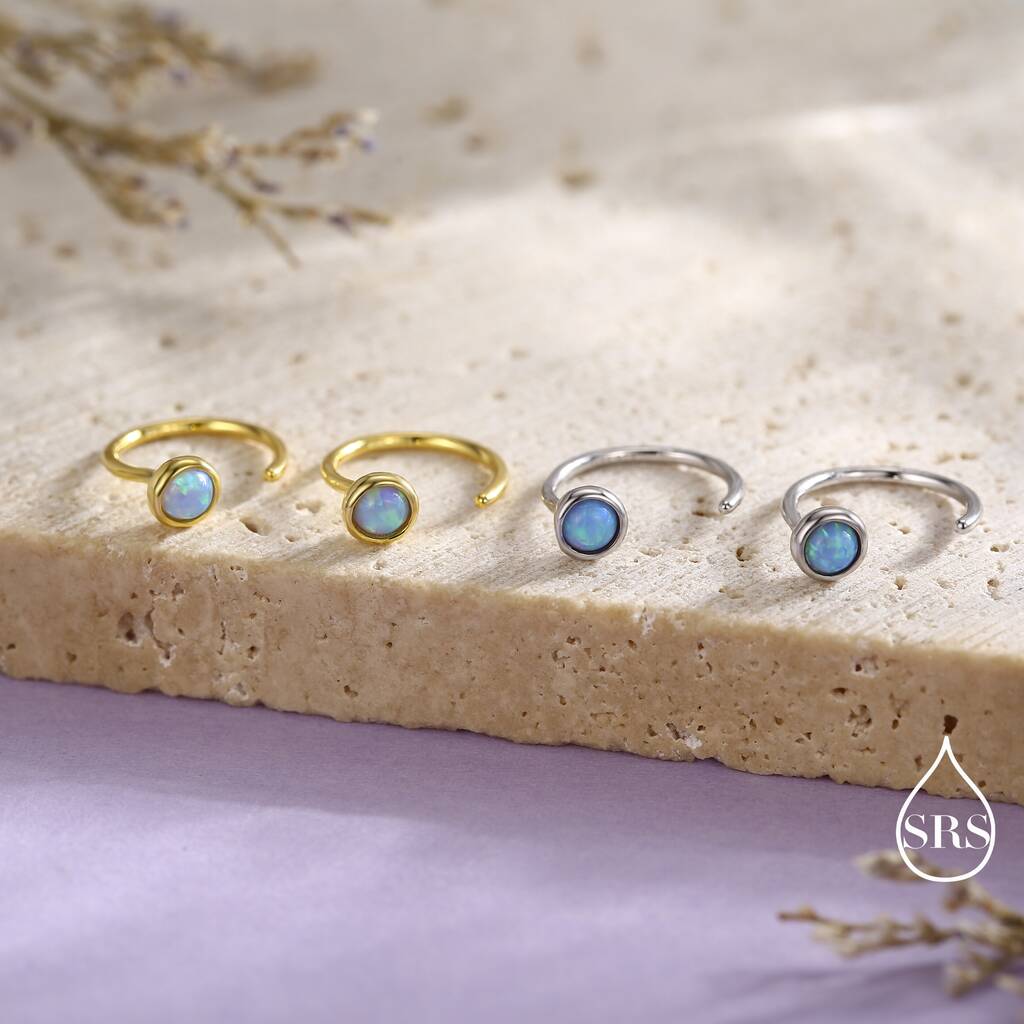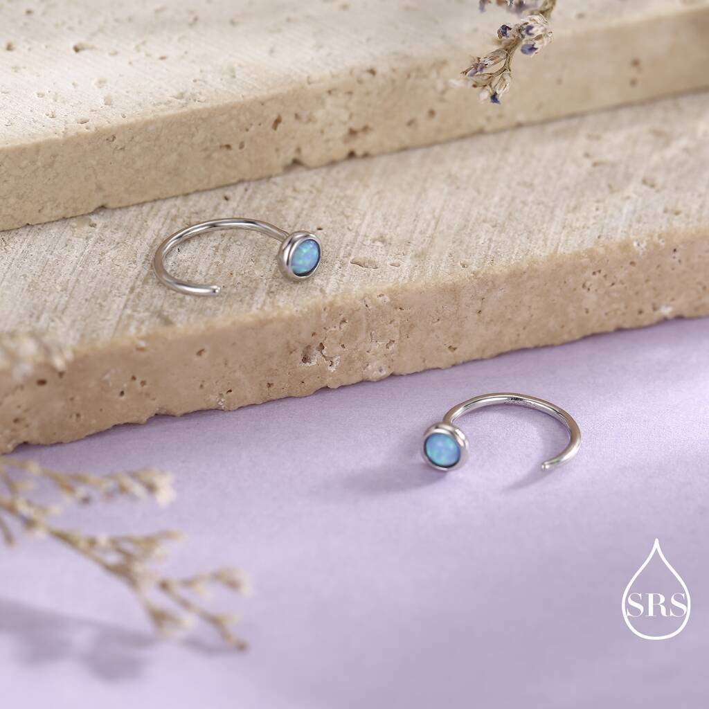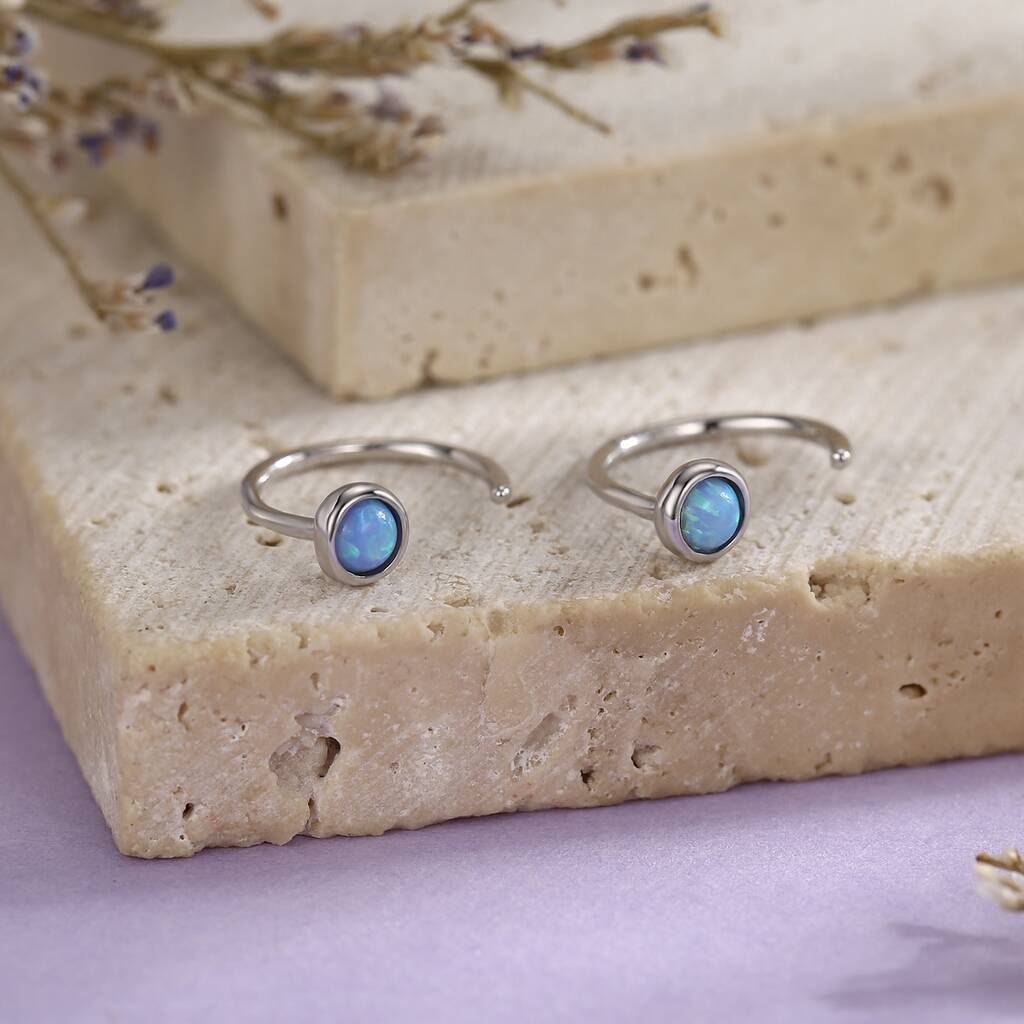 Sterling silver huggie hoop threader earrings featuring blue opal accents, adding vibrant iridescent sparkle, modern-elegance, and a chic, stylish touch to everyday wear or gifting.