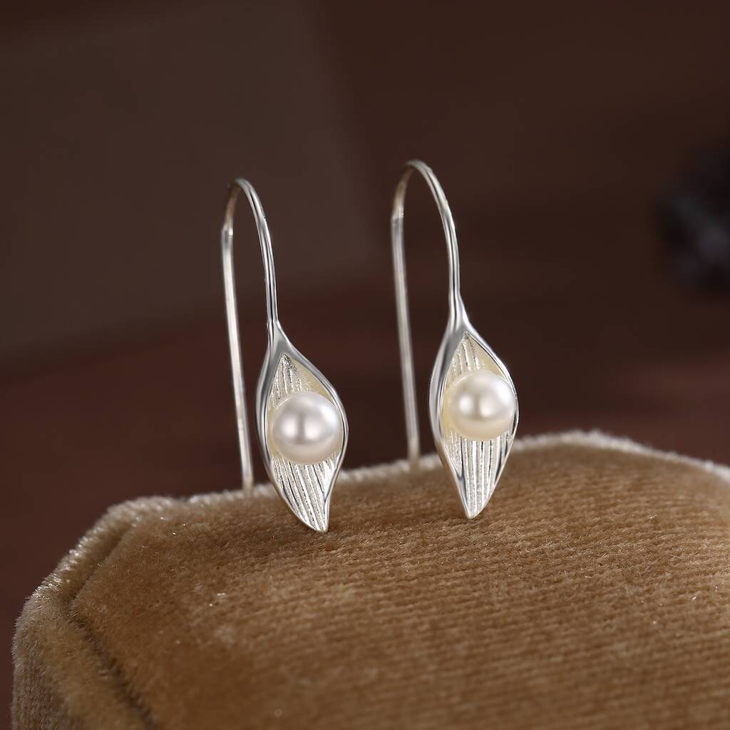 Sterling silver hook earrings featuring elegant calla lily blossoms accented with freshwater pearls, adding timeless beauty, delicate-charm, and a stylish touch to everyday-wear or gifting.