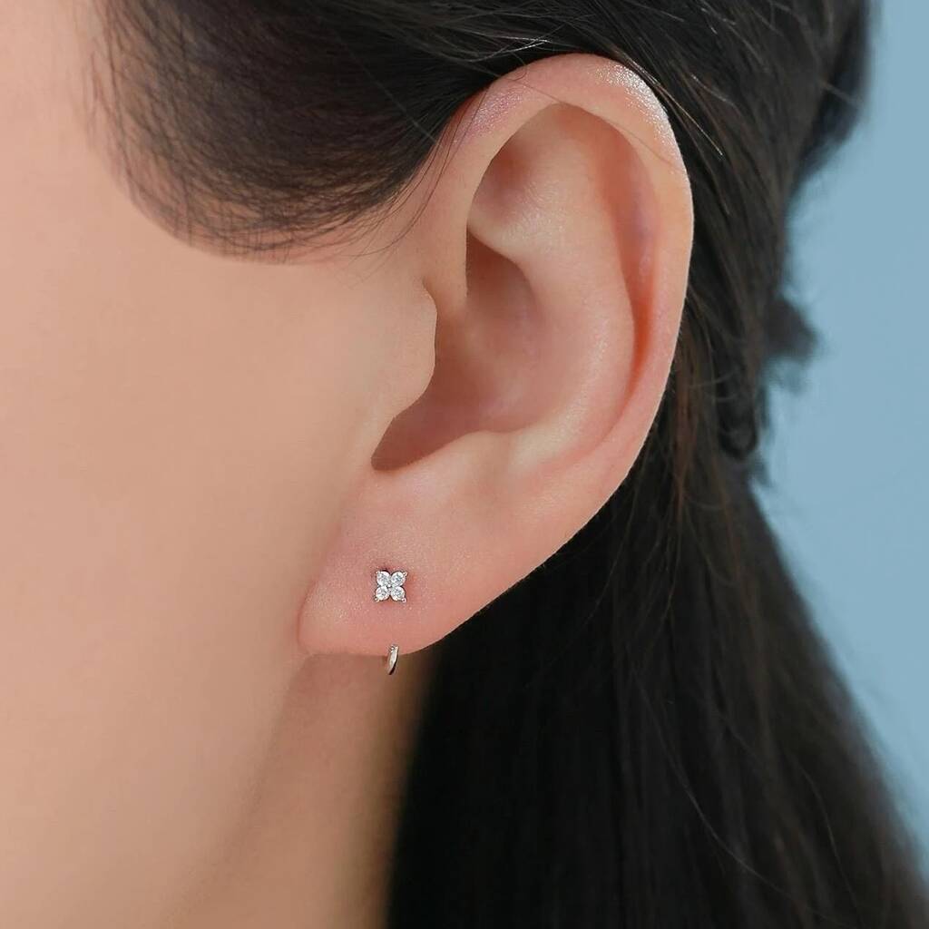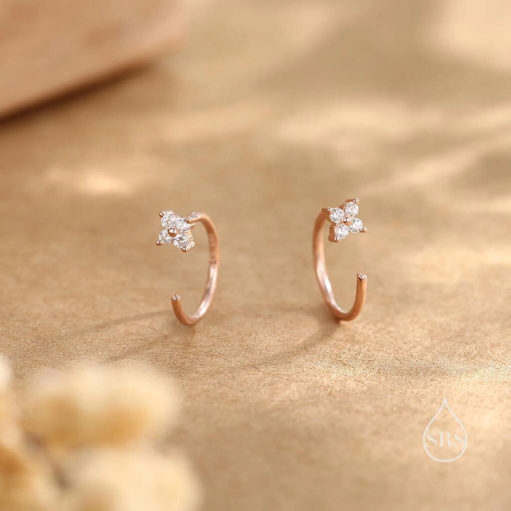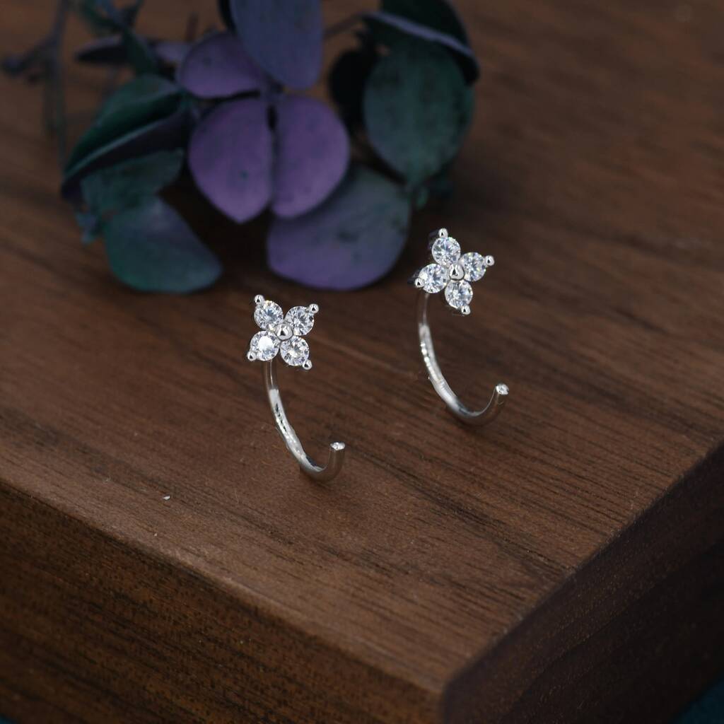 Sterling silver huggie hoop earrings featuring CZ-adorned hydrangea flower designs, adding sparkling elegance, delicate floral charm, and a stylish, feminine touch to everyday-wear or gifting.