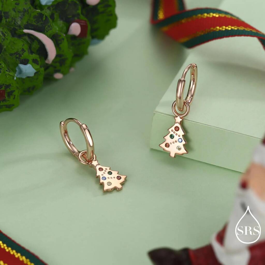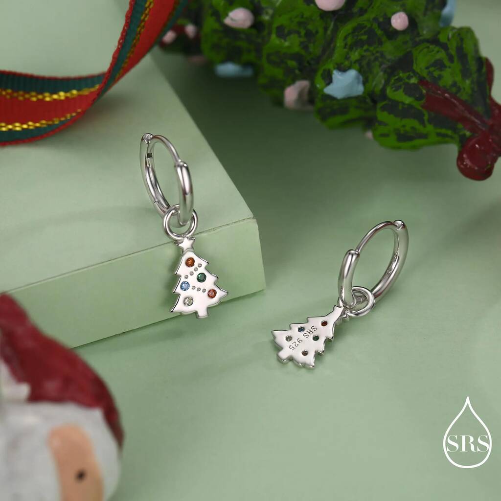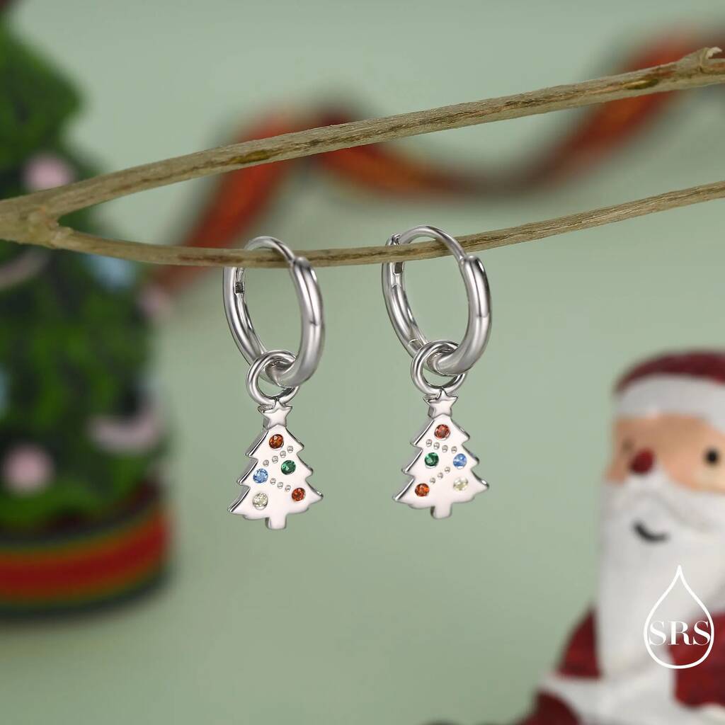 Sterling silver hoop earrings featuring dainty Christmas tree charms, adding festive charm, subtle sparkle, and a cheerful, stylish touch to holiday outfits or seasonal gifting.