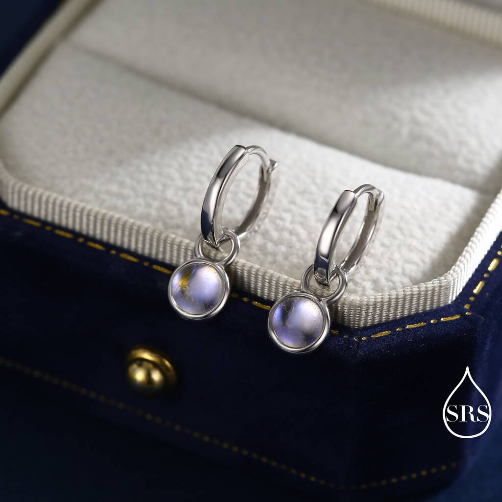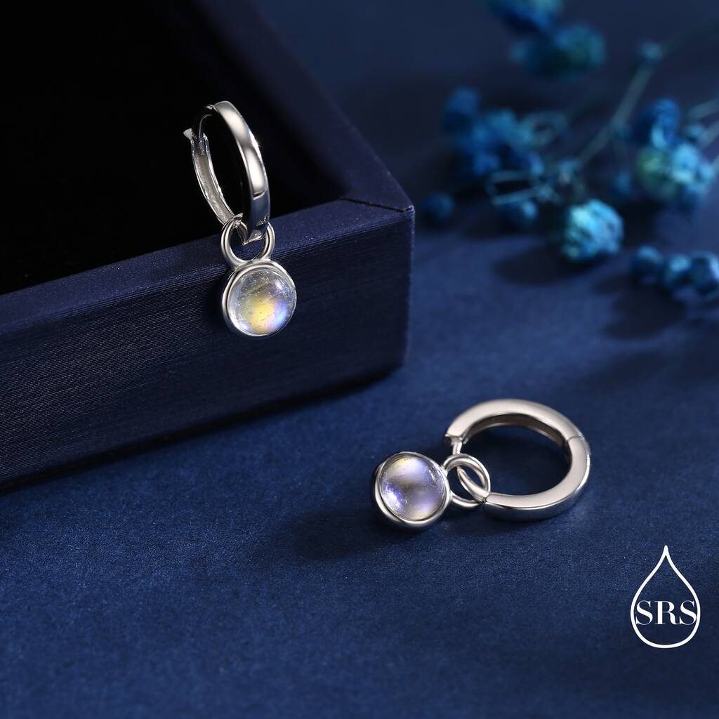 Chic dangle moonstone huggie hoop earrings. Embrace the ethereal beauty of moonstone with a touch of timeless charm. Ideal for daily wear or gifting grace.