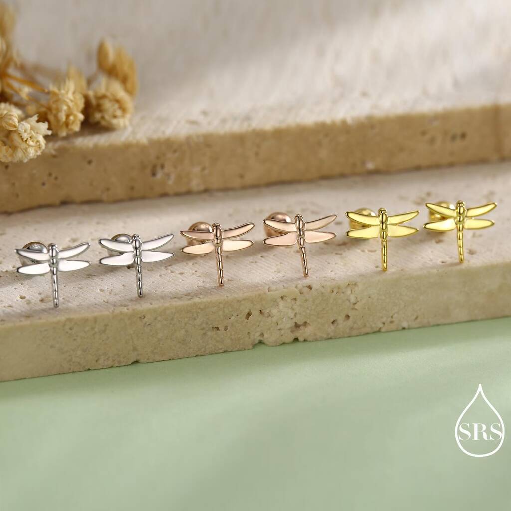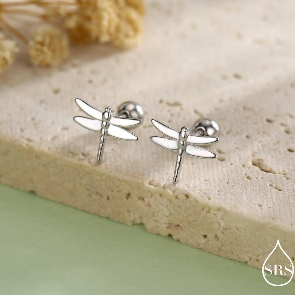Delicate sterling silver studs featuring graceful dragonfly designs with secure screw backs, adding whimsical charm and a nature-inspired touch to everyday wear or gifting.