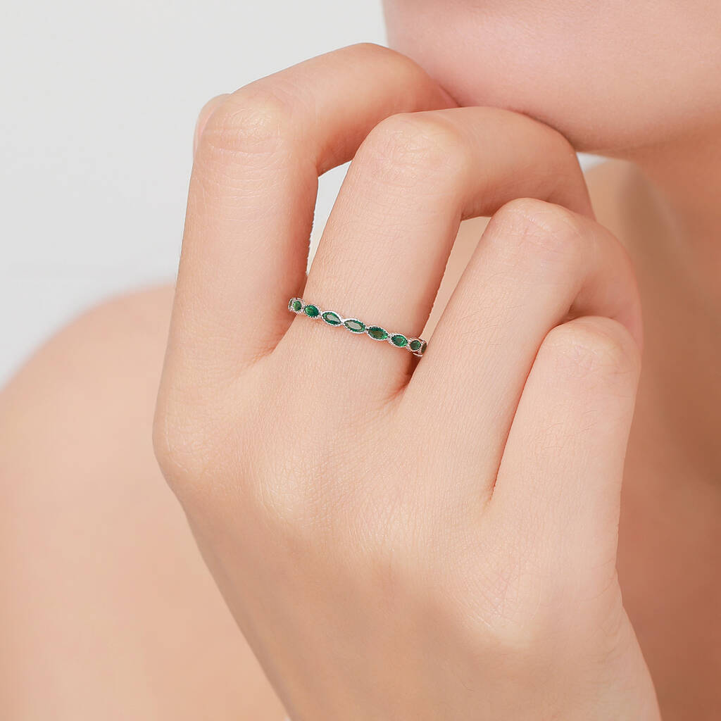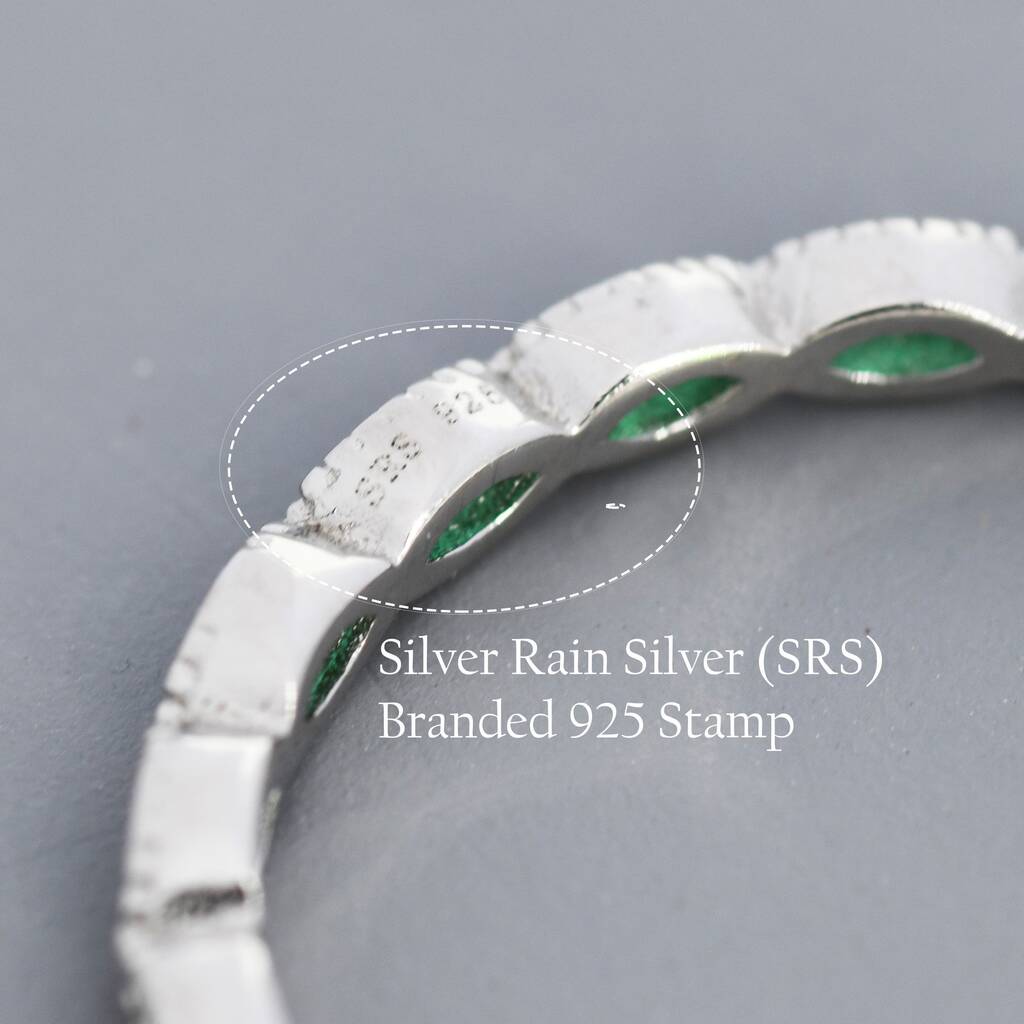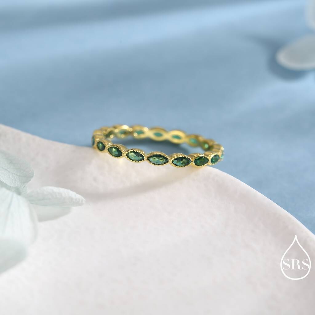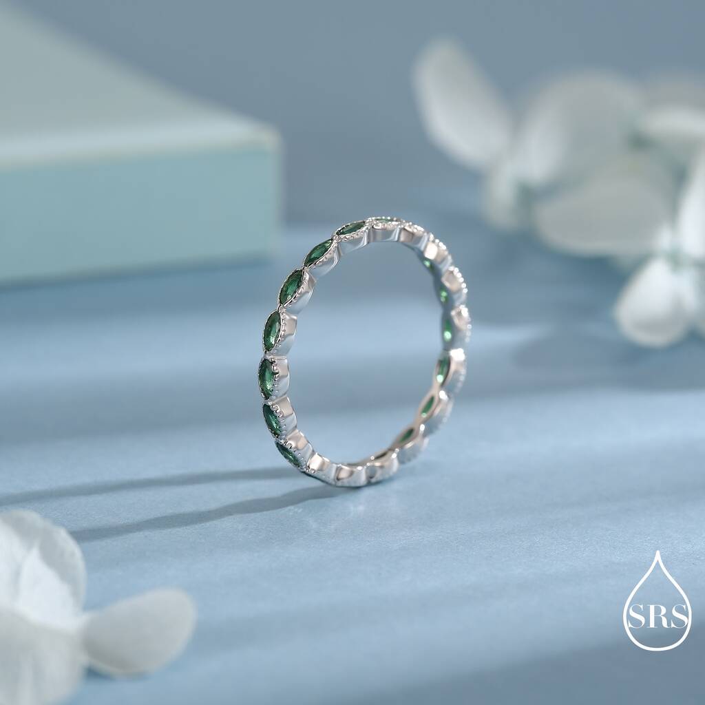 Stylish emerald green marquise CZ infinity ring in sterling silver. Embrace endless elegance and sparkle. Perfect for adorning your fingers or gifting timeless allure.