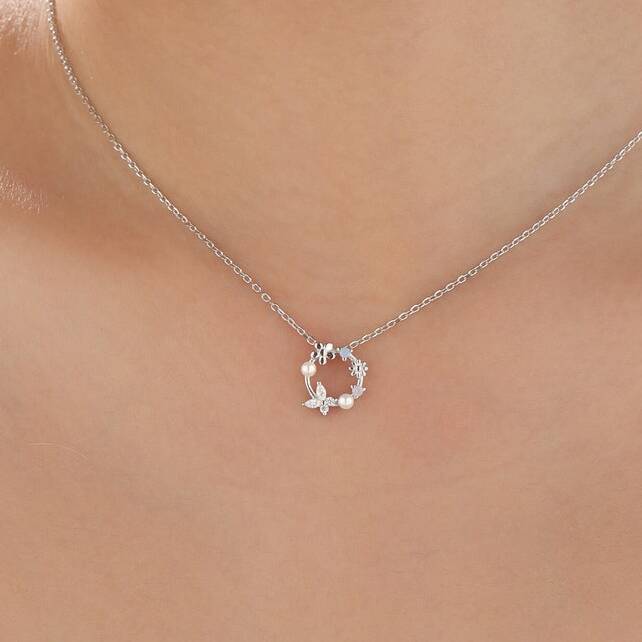 Sterling Silver Forget Me Not Flower And Butterfly Wreath Necklace