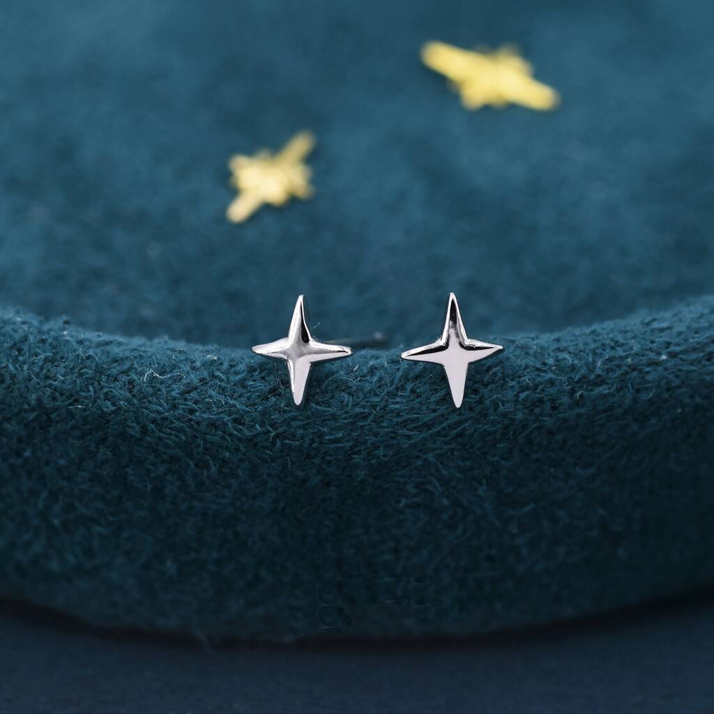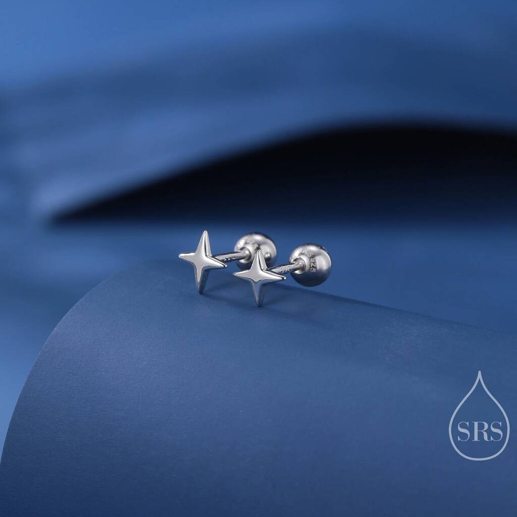 Sterling silver earrings featuring four-point star designs with screw ball backs, adding subtle sparkle, modern elegance, and a celestial-inspired touch to everyday wear.