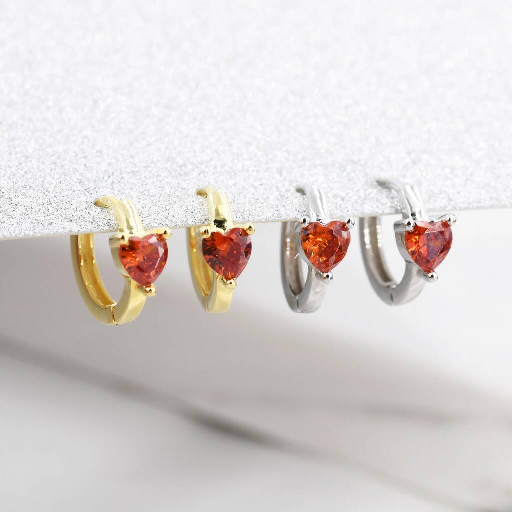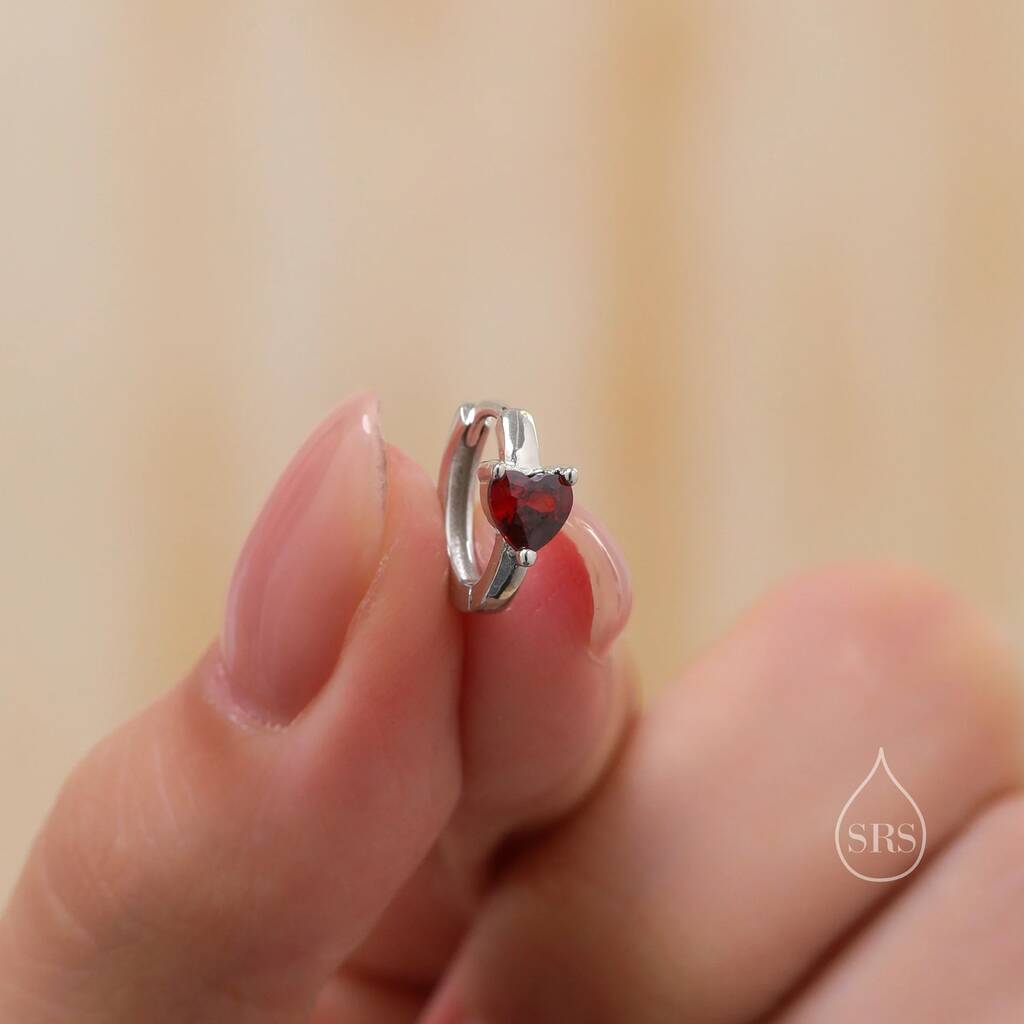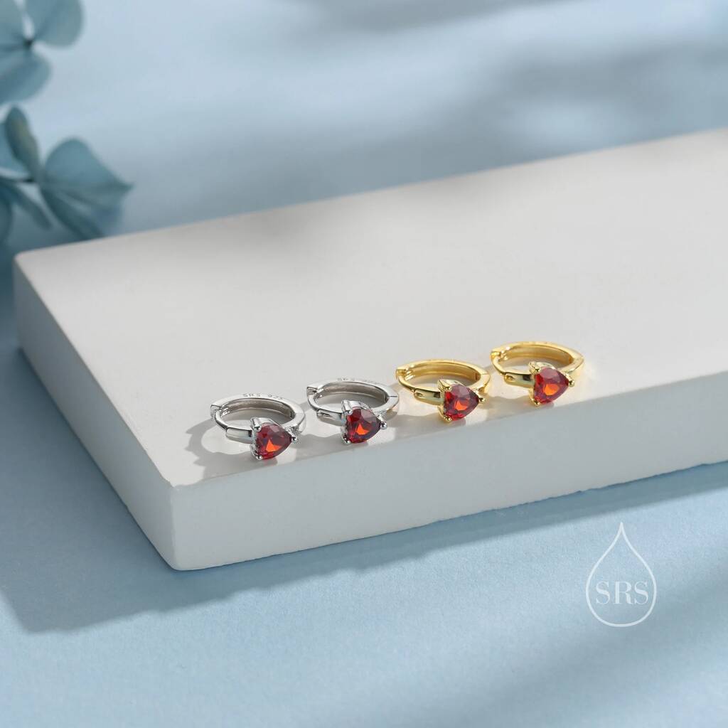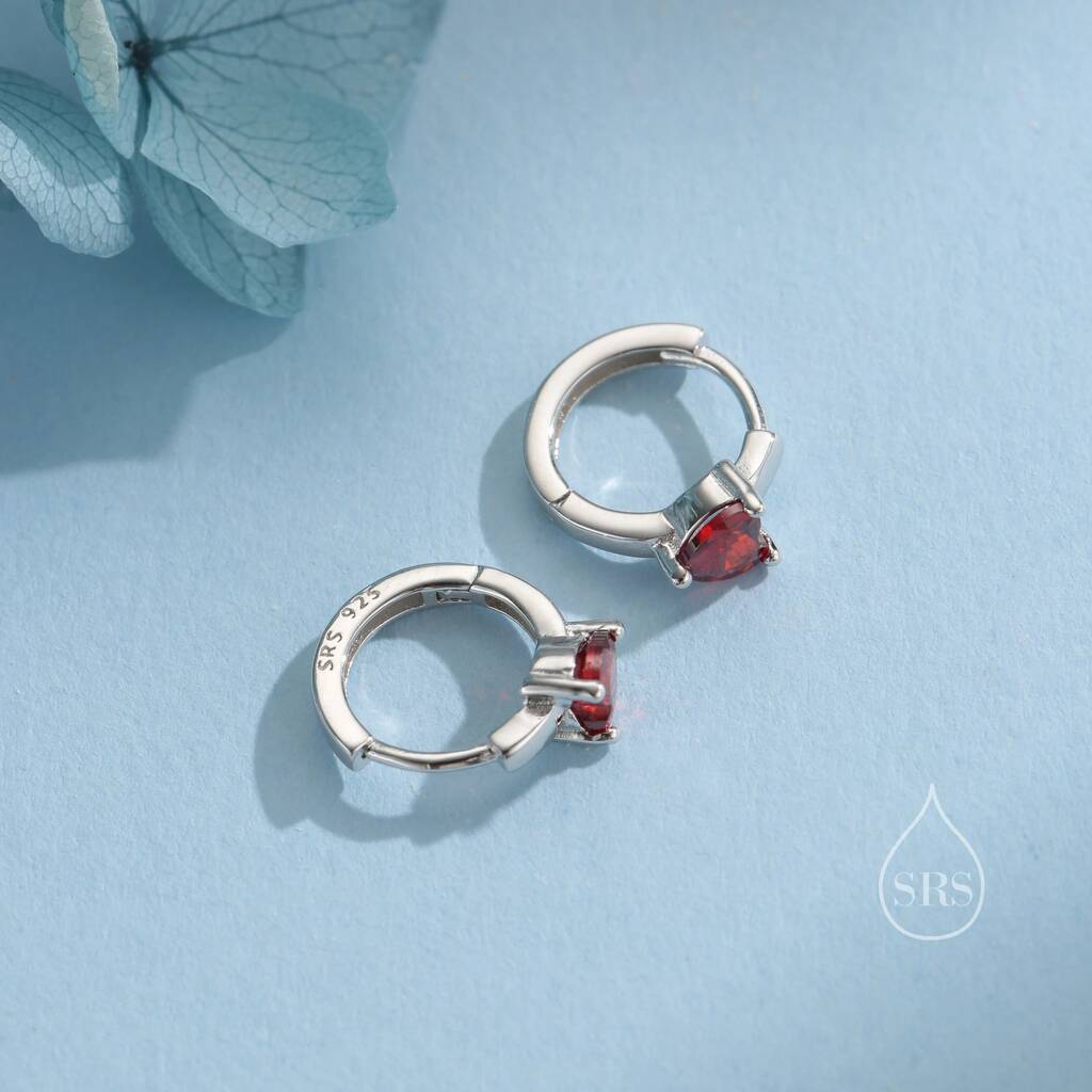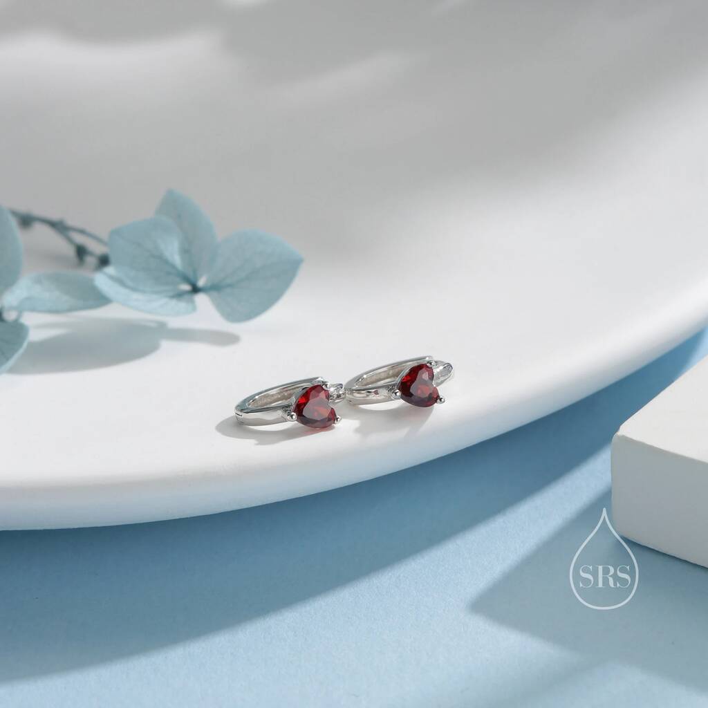 Chic garnet red heart CZ huggie hoop earrings. Elevate your style with a touch of romantic elegance. Perfect for adding allure or gifting heartfelt charm.