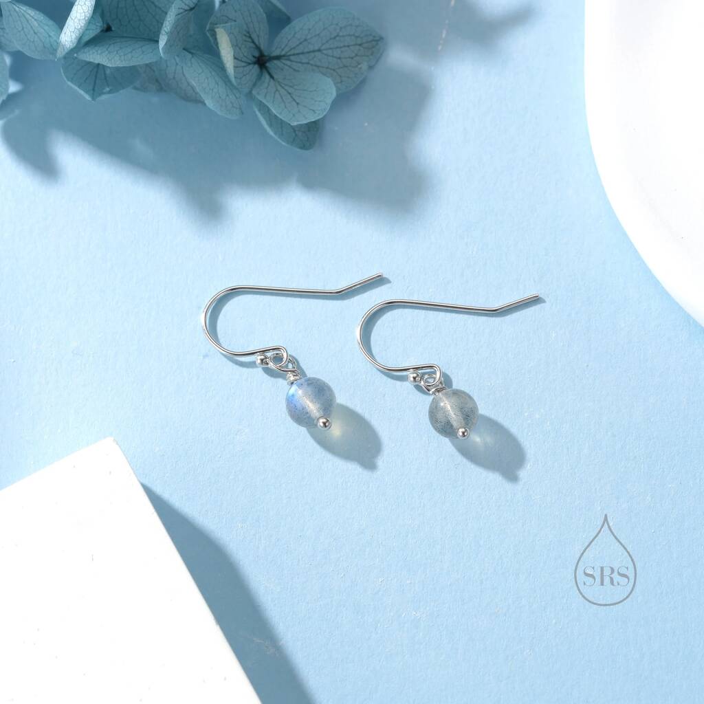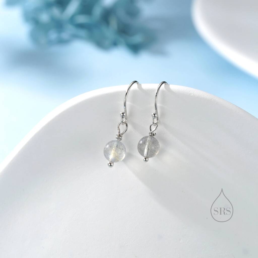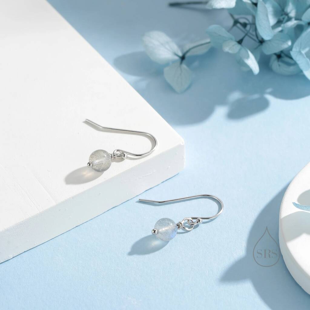 Genuine Labradorite Drop Hook Earrings in Sterling Silver, featuring iridescent labradorite stones on elegant hooks, adding mystical shimmer and timeless elegance to any look.