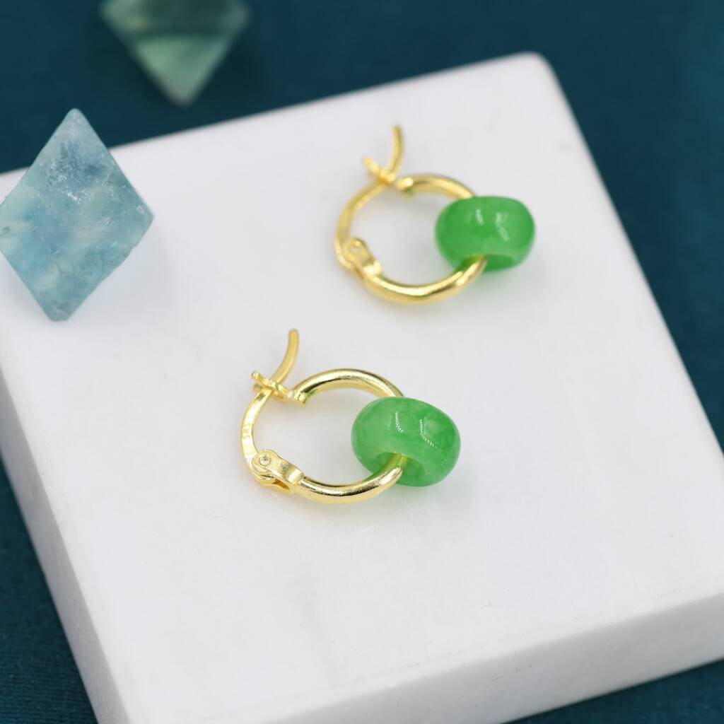 Add a touch of timeless elegance with our Sterling-Silver Green Jade Donut Huggie Hoop Earrings, perfect for a sophisticated and vibrant accent to any outfit.