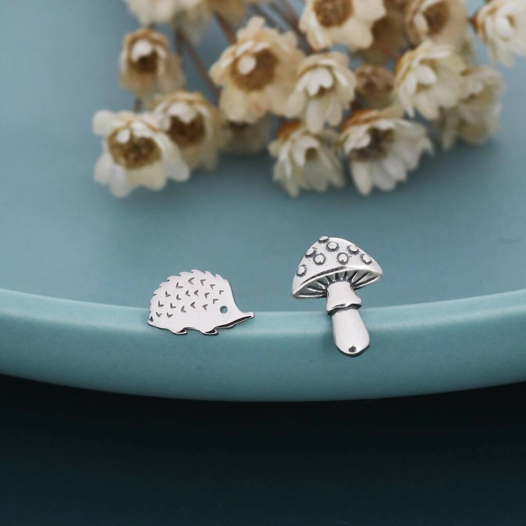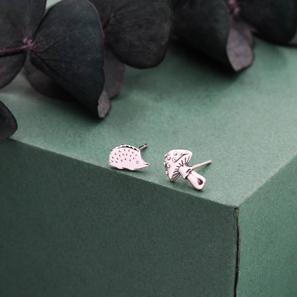Mismatched Hedgehog and Mushroom Stud Earrings in Sterling Silver – whimsical woodland-inspired pair, adding playful forest charm and unique character to your everyday jewelry style.