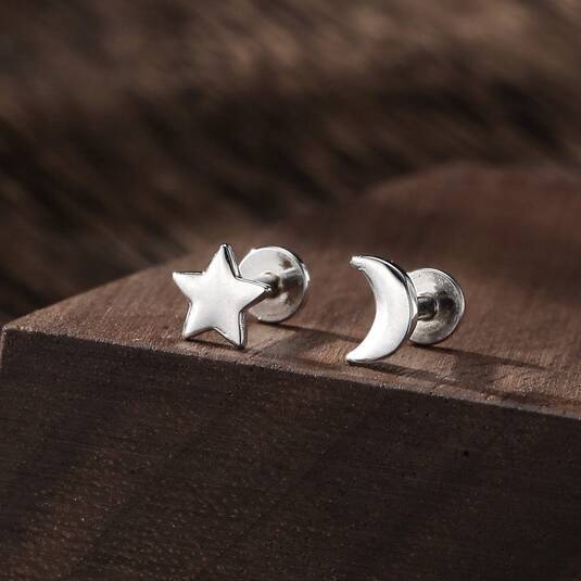 Mismatched Moon And Star Flat Back Earrings In Sterling Silver