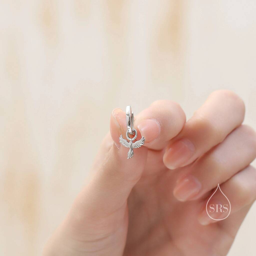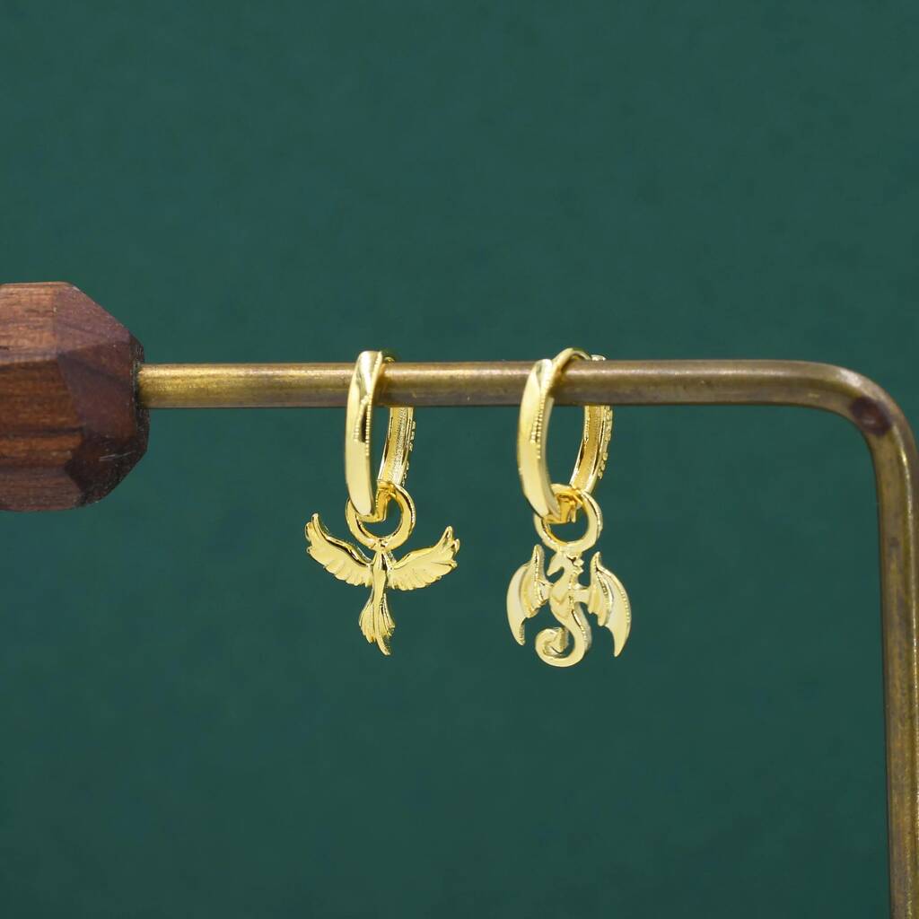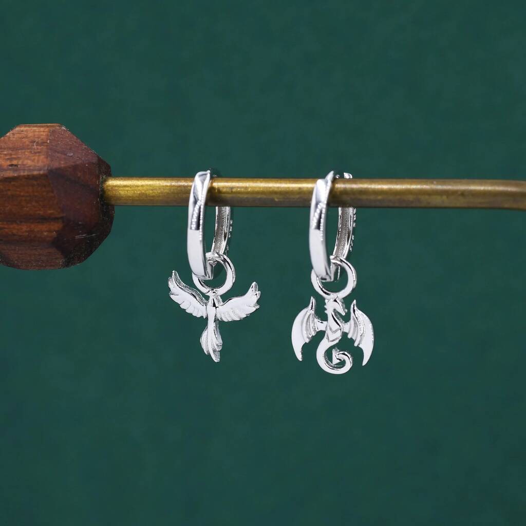 Mismatched Phoenix And Dragon Charm Huggie Hoop Earrings In Sterling Silver