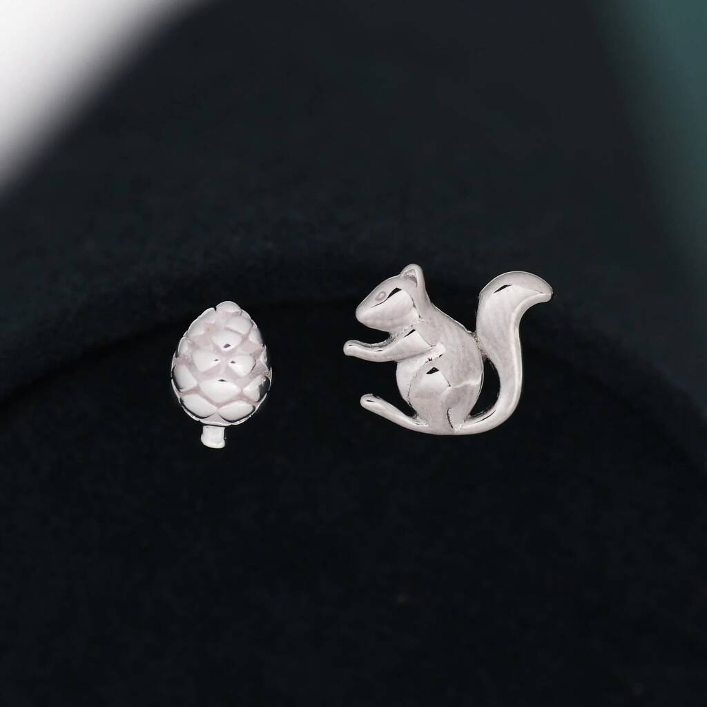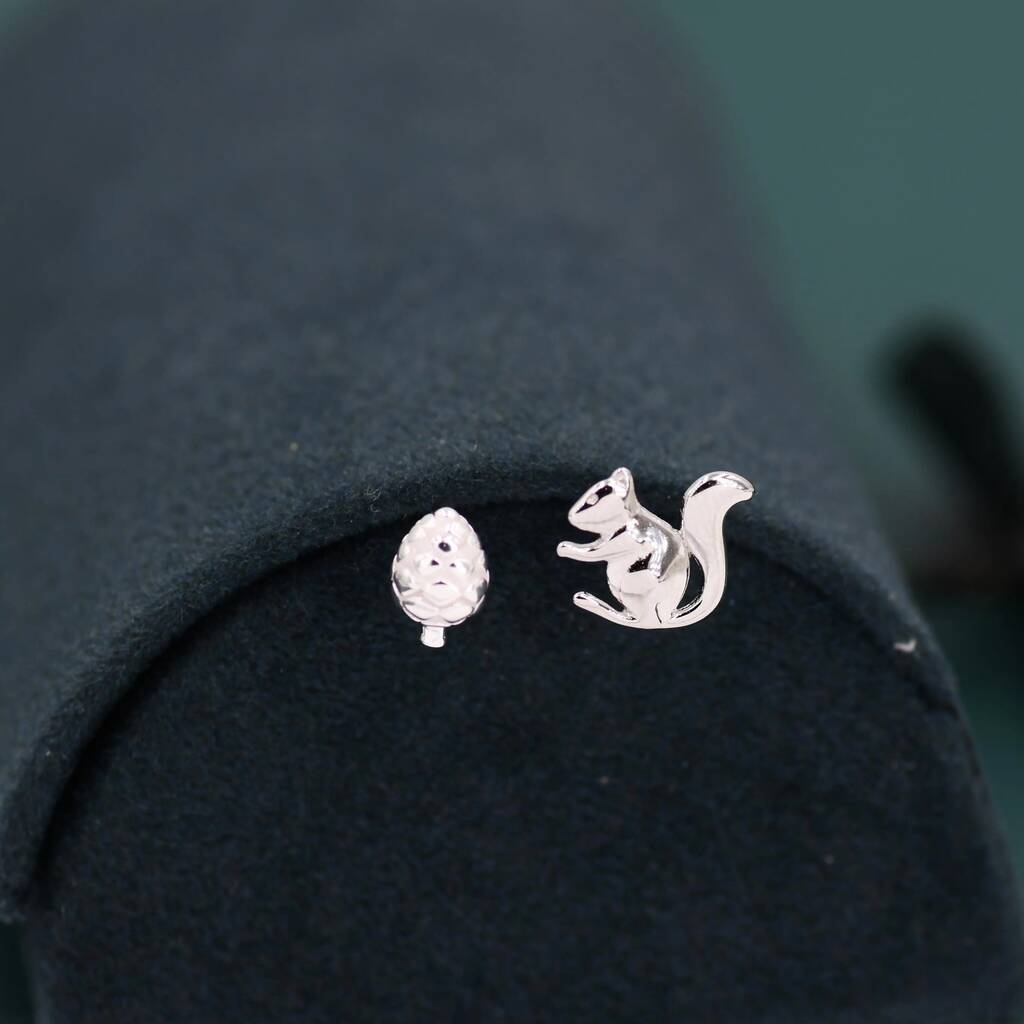 Mismatched Pine Cone and Squirrel Stud Earrings in Sterling Silver — charming woodland-inspired design, adding a playful and nature-loving touch to your jewelry collection.