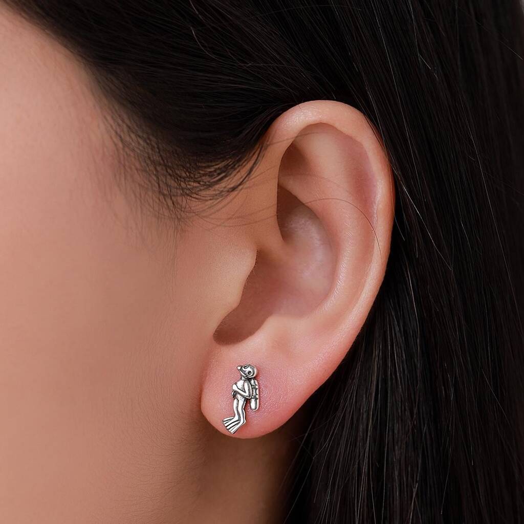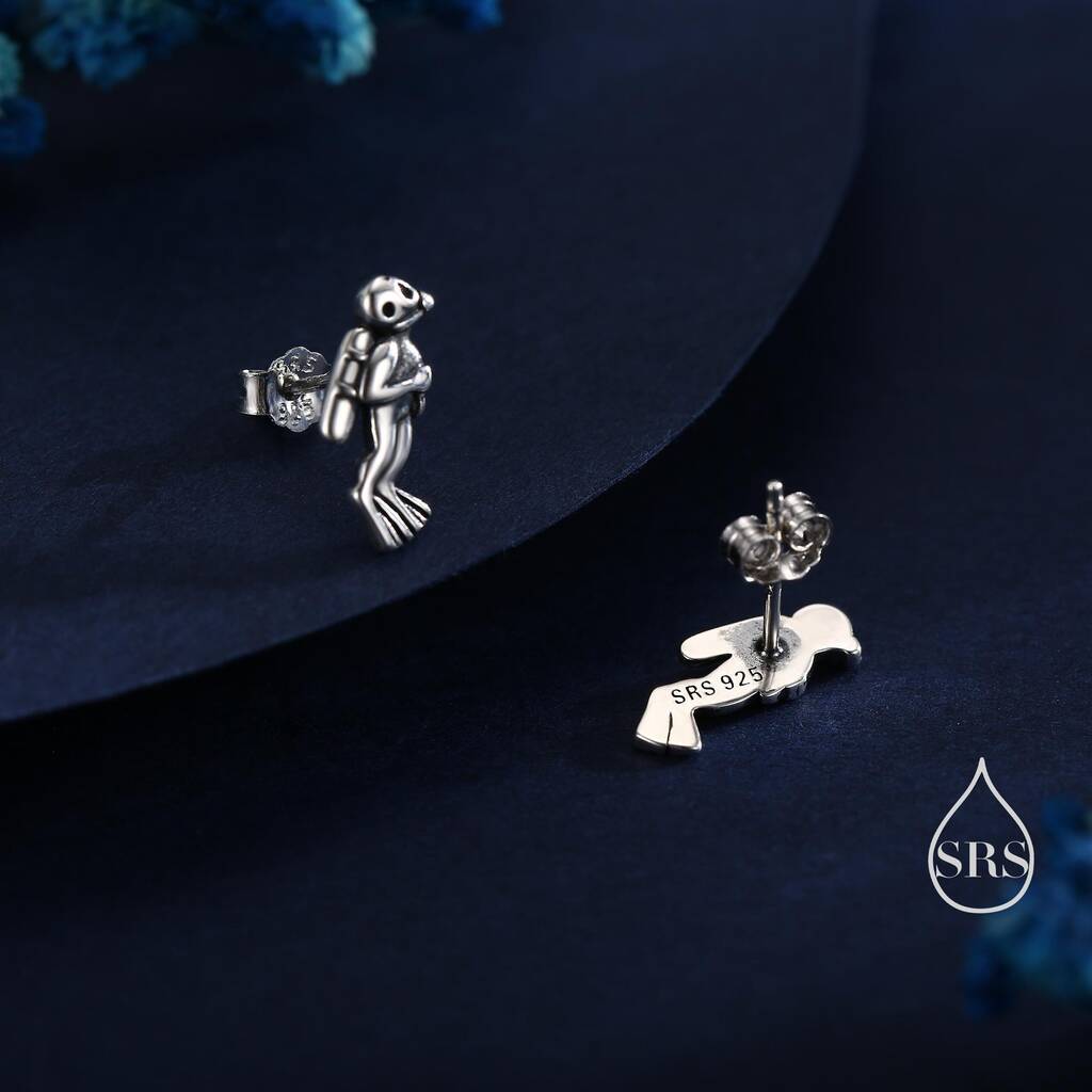 Mismatched Scuba Diver & Manta Ray Stud Earrings in Sterling Silver — whimsical ocean-inspired pair, adding playful charm and unique marine elegance to your jewelry-collection.