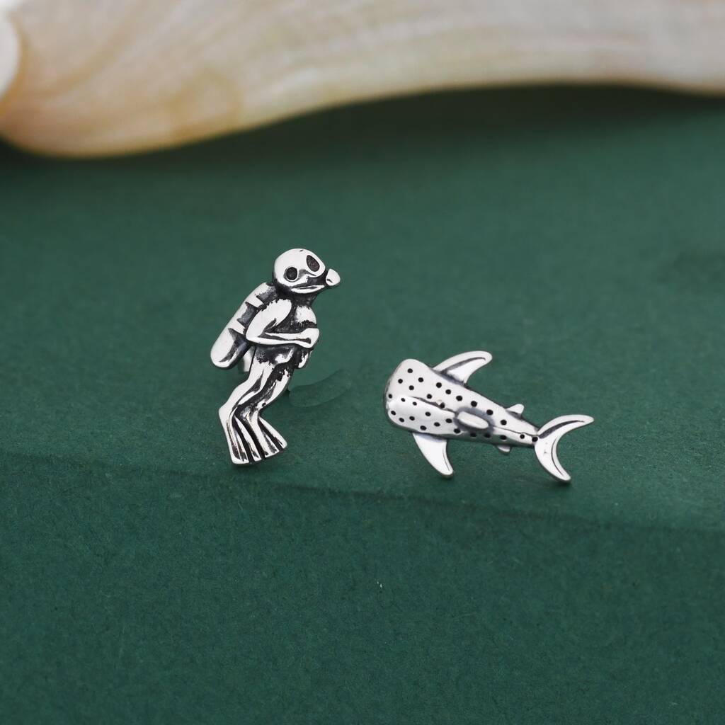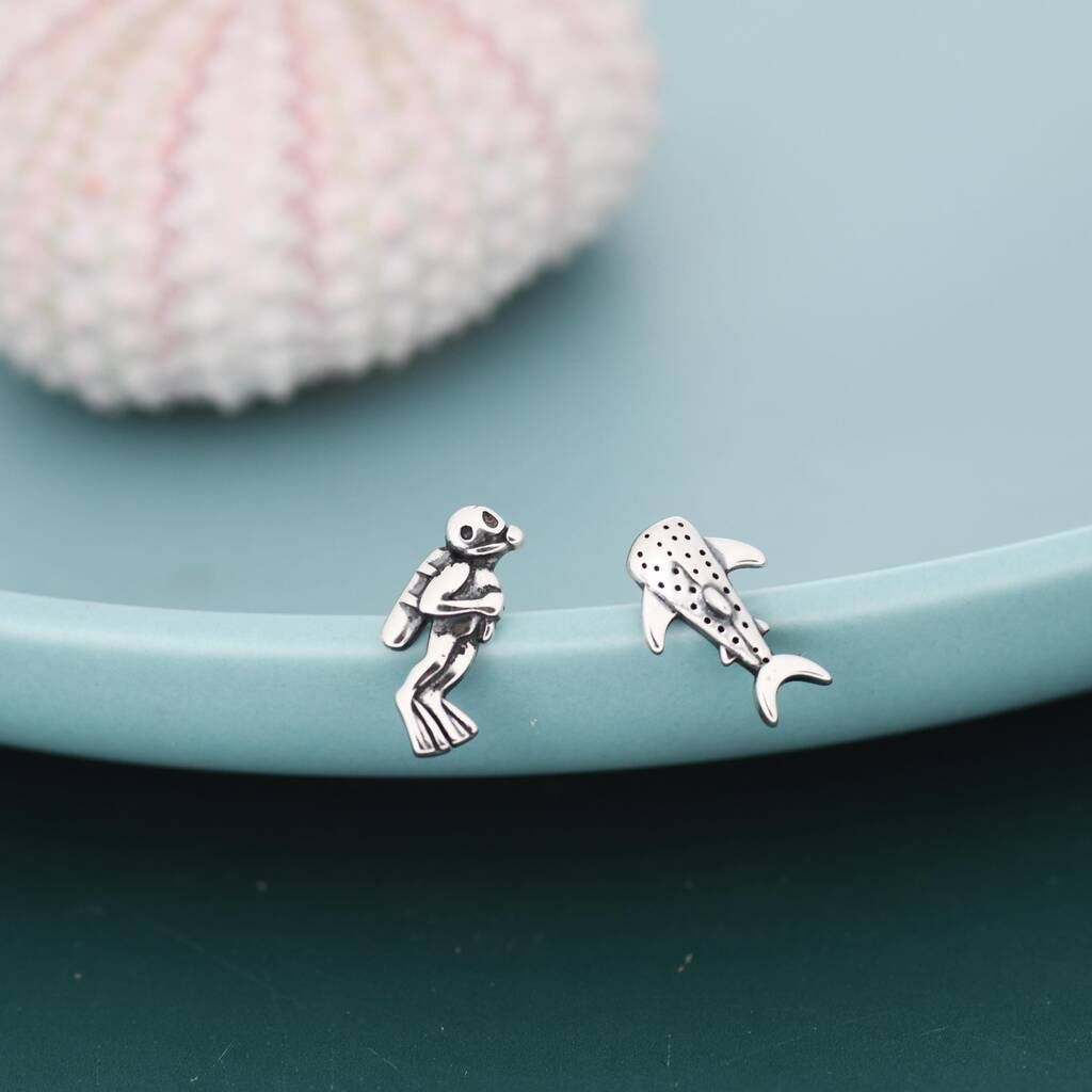 Mismatched Scuba Diver And Whale Shark Stud Earrings In Sterling Silver