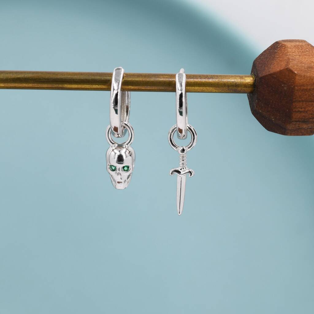 Mismatched Skull and Sword Huggie Hoop Earrings in Sterling Silver offer edgy, gothic charm with a bold asymmetrical design, perfect for alternative fashion styles.