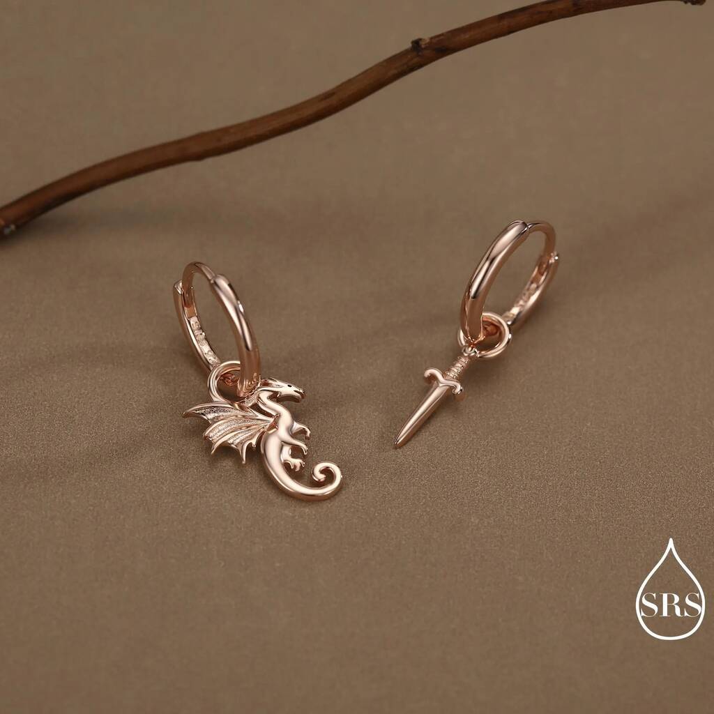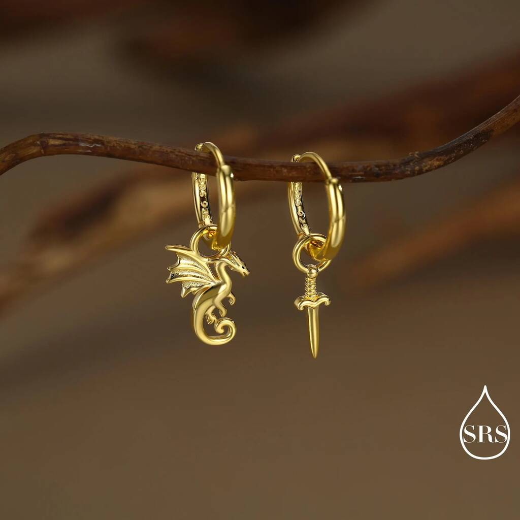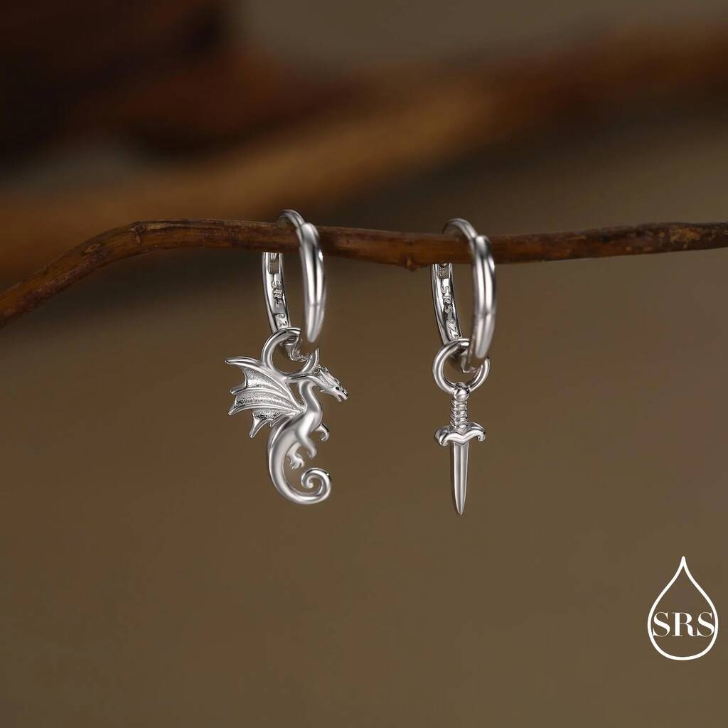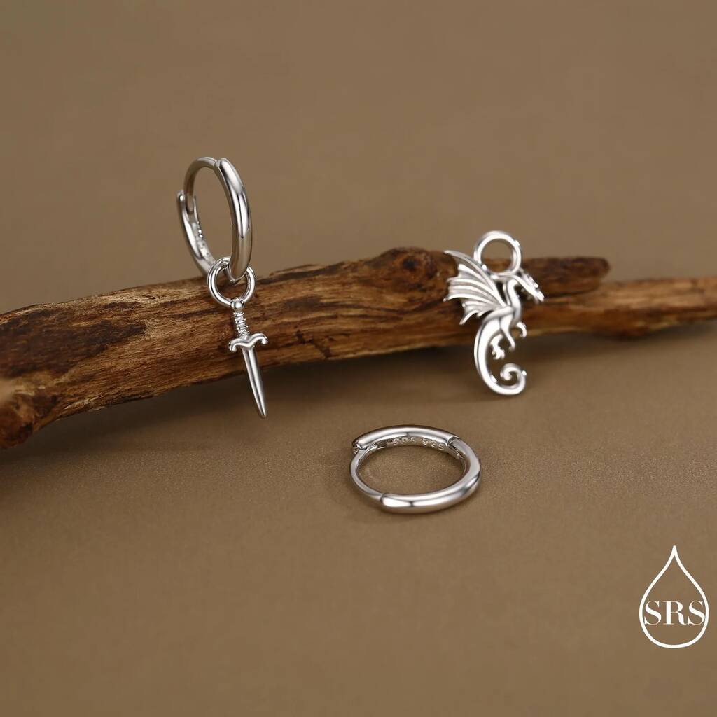 Sterling silver huggie hoops with a mismatched dragon and sword design. Bold, fantasy-inspired detail for a unique everyday or statement look.