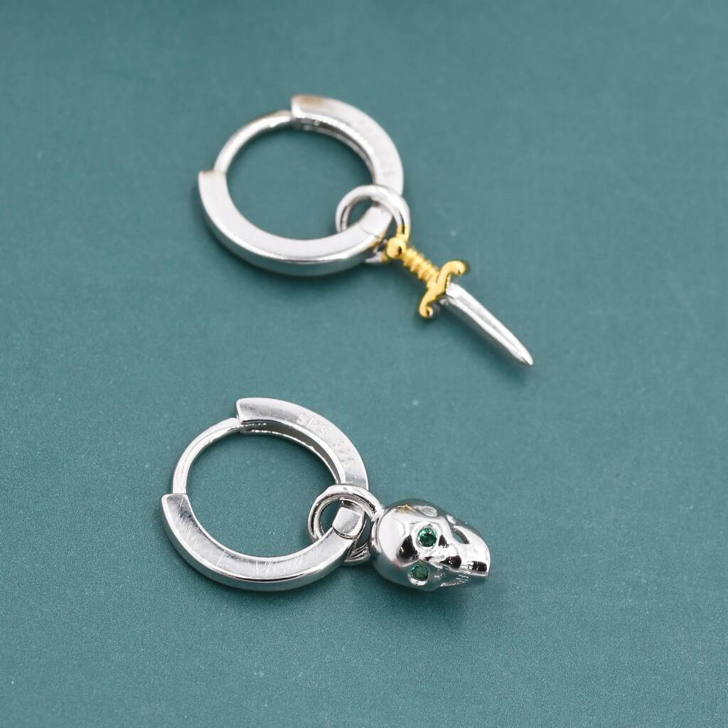 Mismatched Tiny Skull and Sword Huggie Hoop Earrings in Sterling Silver feature edgy, miniature design, adding subtle gothic charm and unique style for everyday wear.