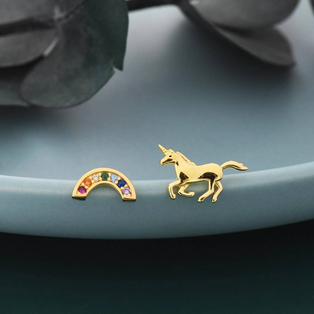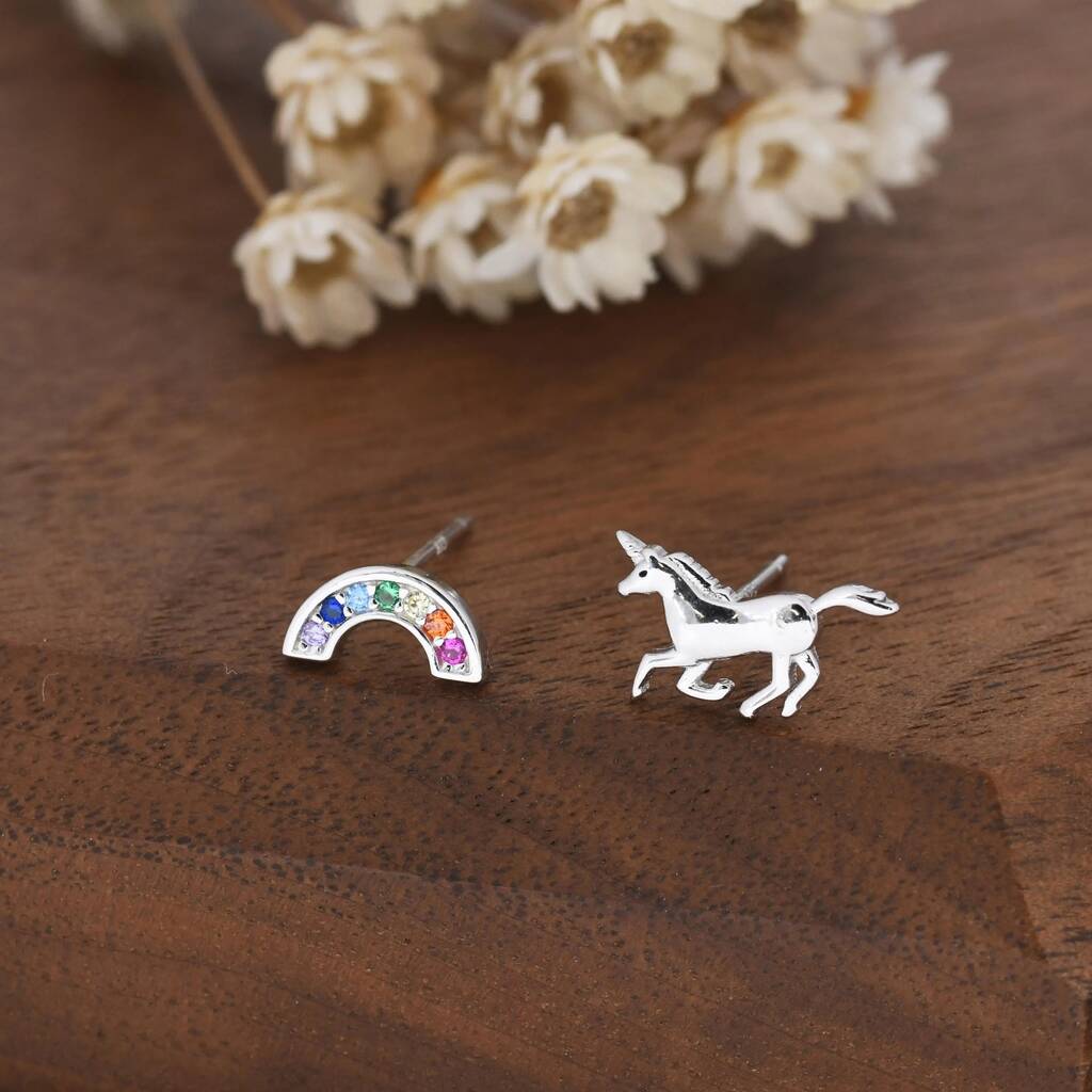 Mismatched Unicorn and Rainbow Stud Earrings in Sterling Silver feature whimsical, fantasy-inspired design, adding playful charm and magical style for everyday wear or special occasions.