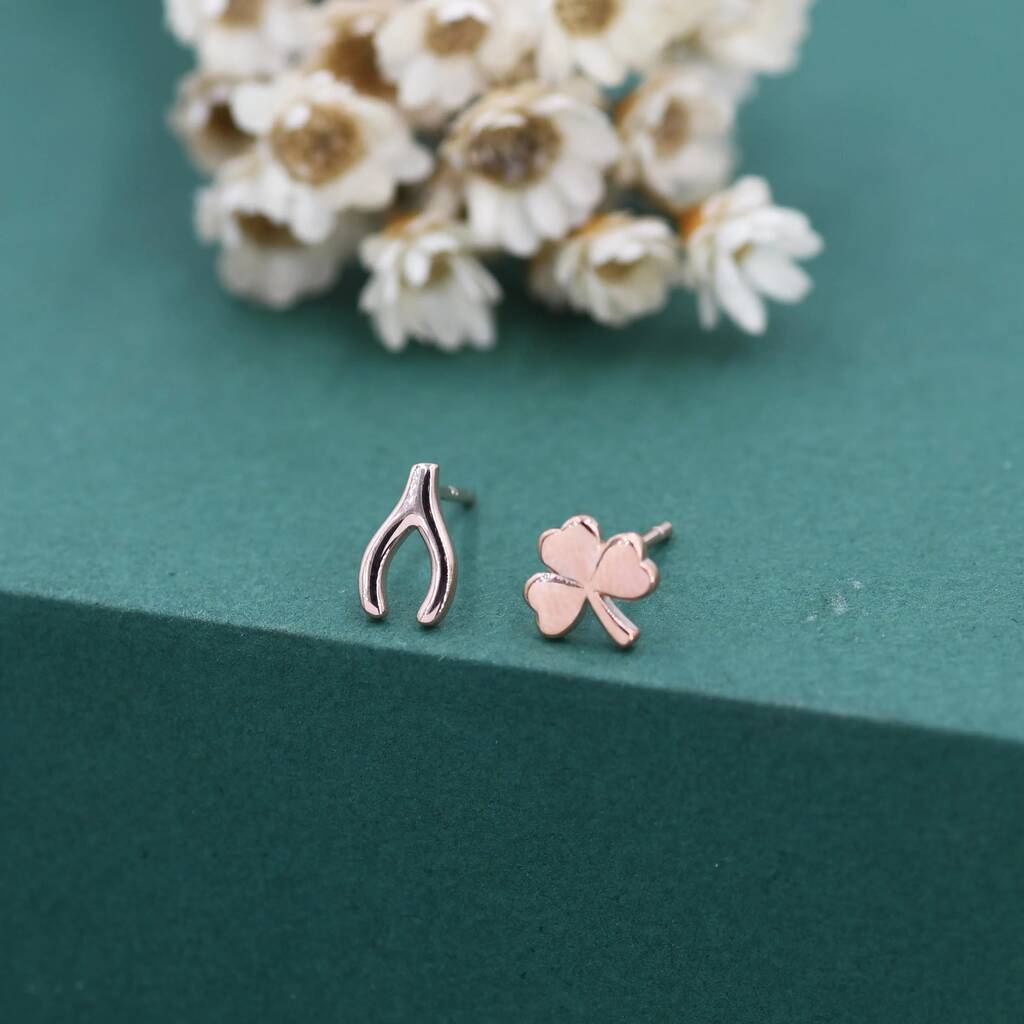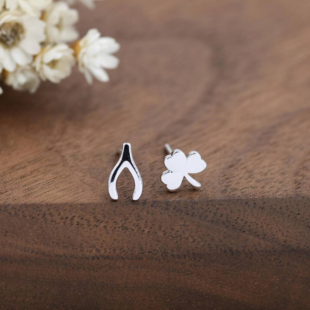 Mismatched Wishbone and Shamrock Leaf Stud Earrings in Sterling Silver — a charming lucky-themed pair, bringing playful elegance and symbolic positivity to your everyday style.