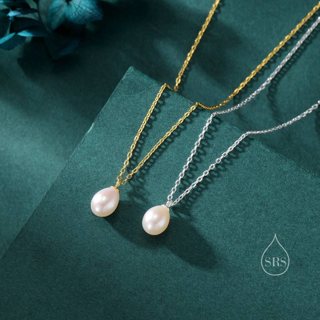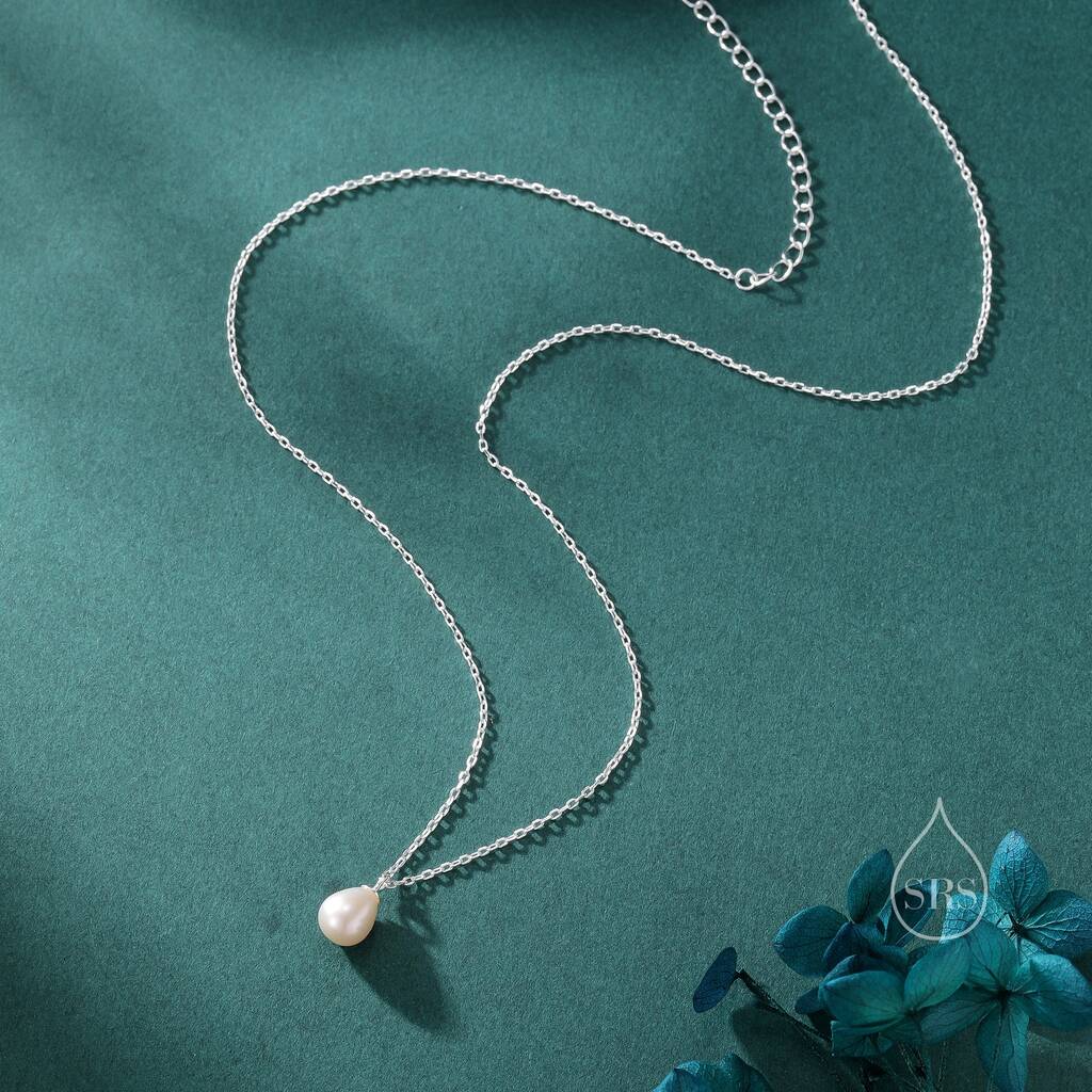 Natural Droplet Pearl Necklace in Sterling Silver, featuring a lustrous freshwater pearl pendant gracefully suspended from a sleek sterling silver chain.