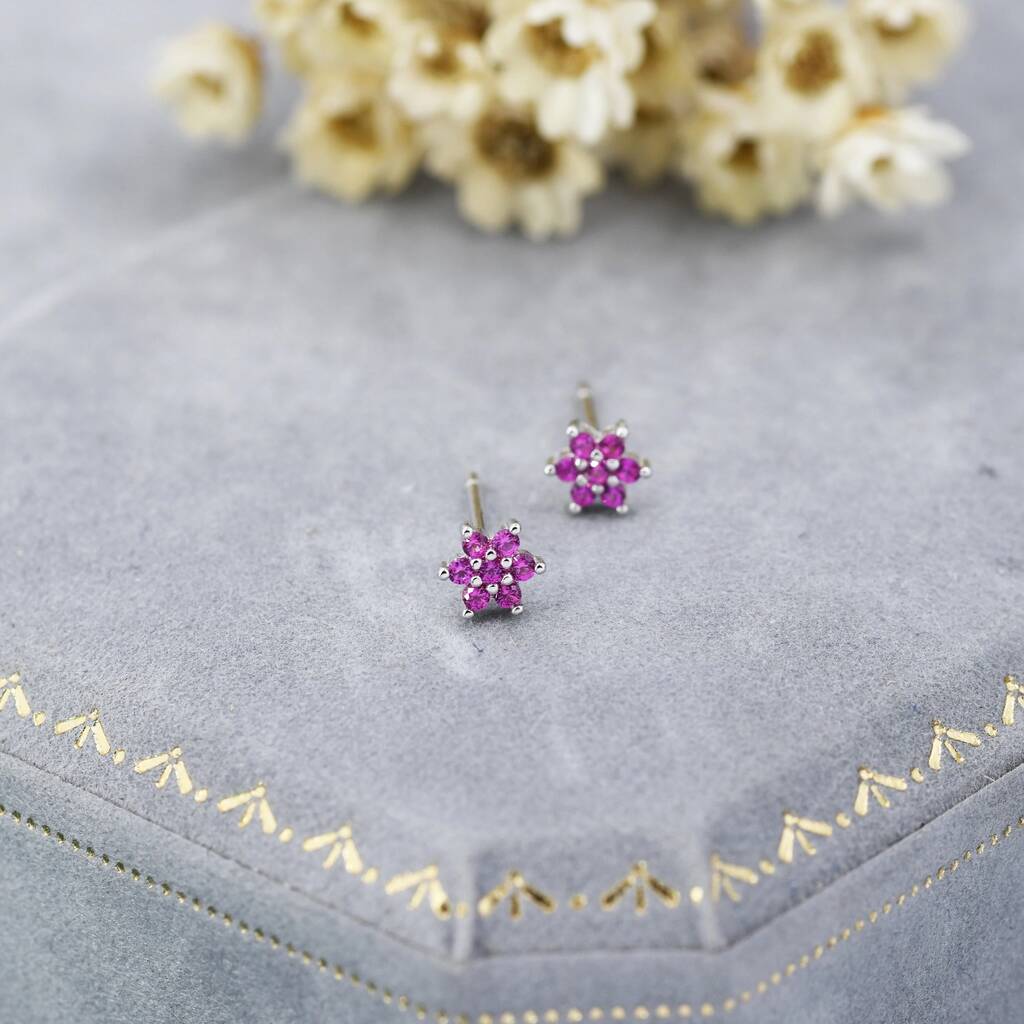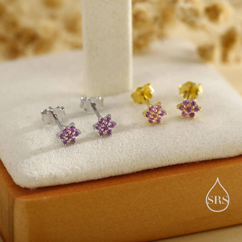 Pair Of Very Tiny Ruby Pink Cz Flower Stud Earrings In Sterling Silver