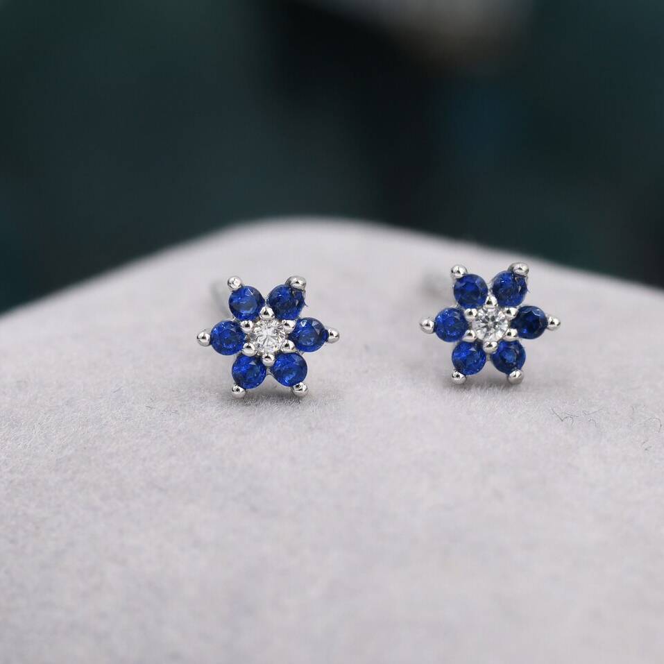 Sterling Silver Tiny Sapphire Blue Cz Flower Internally Threaded Flat Back / Screw Back / Stud Earrings