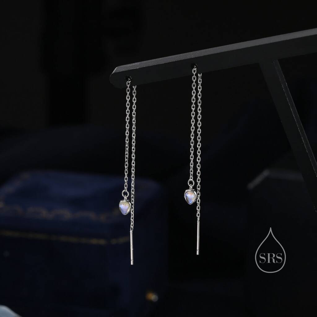 Stylish moonstone droplet long threader earrings in sterling silver. Embrace celestial elegance with modern charm. Ideal for adding a subtle statement to your daily look.