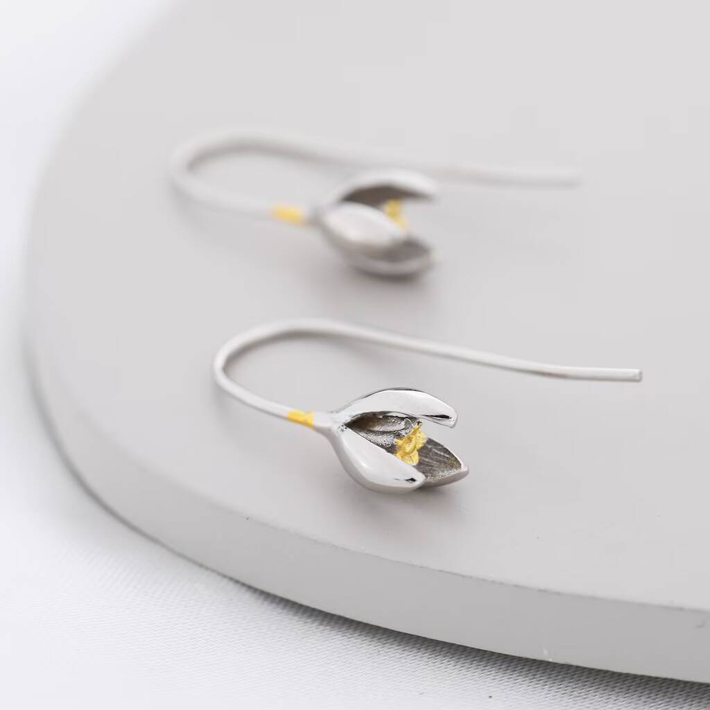 Elegant snowdrop flower earrings in sterling silver. Symbolizing hope and renewal, they're perfect for a fresh touch to any outfit or as a gift.