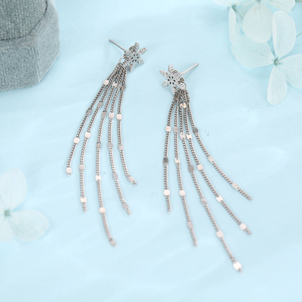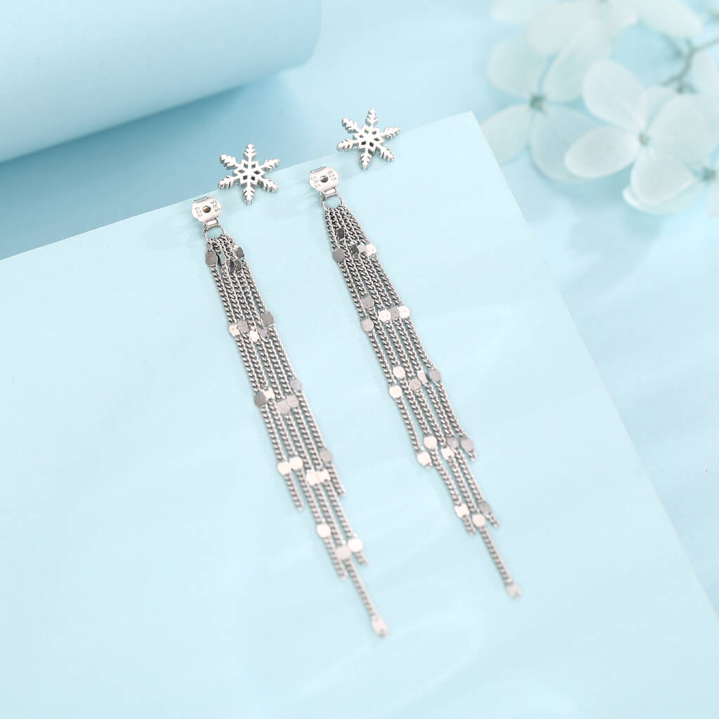 Snowflake Dangle Drop Stud Earrings In Sterling Silver With Sparkle Tassels