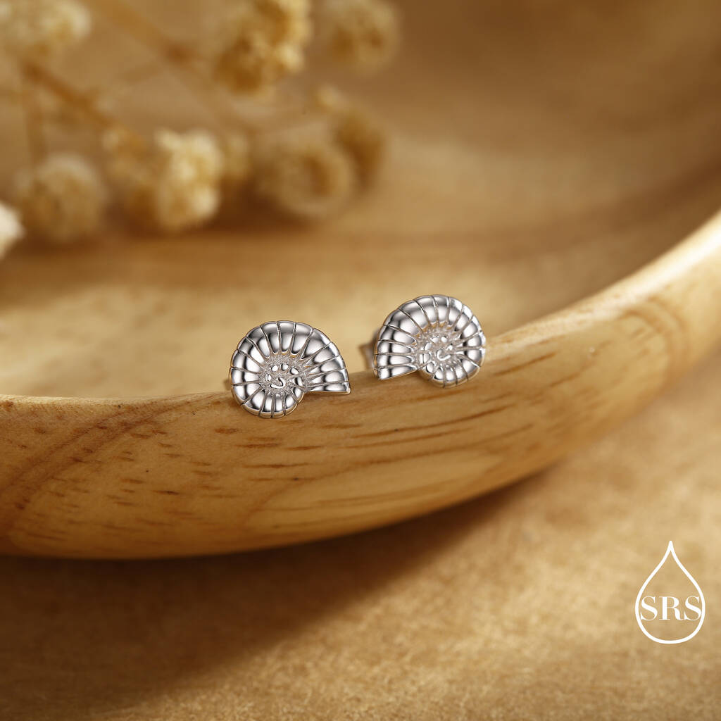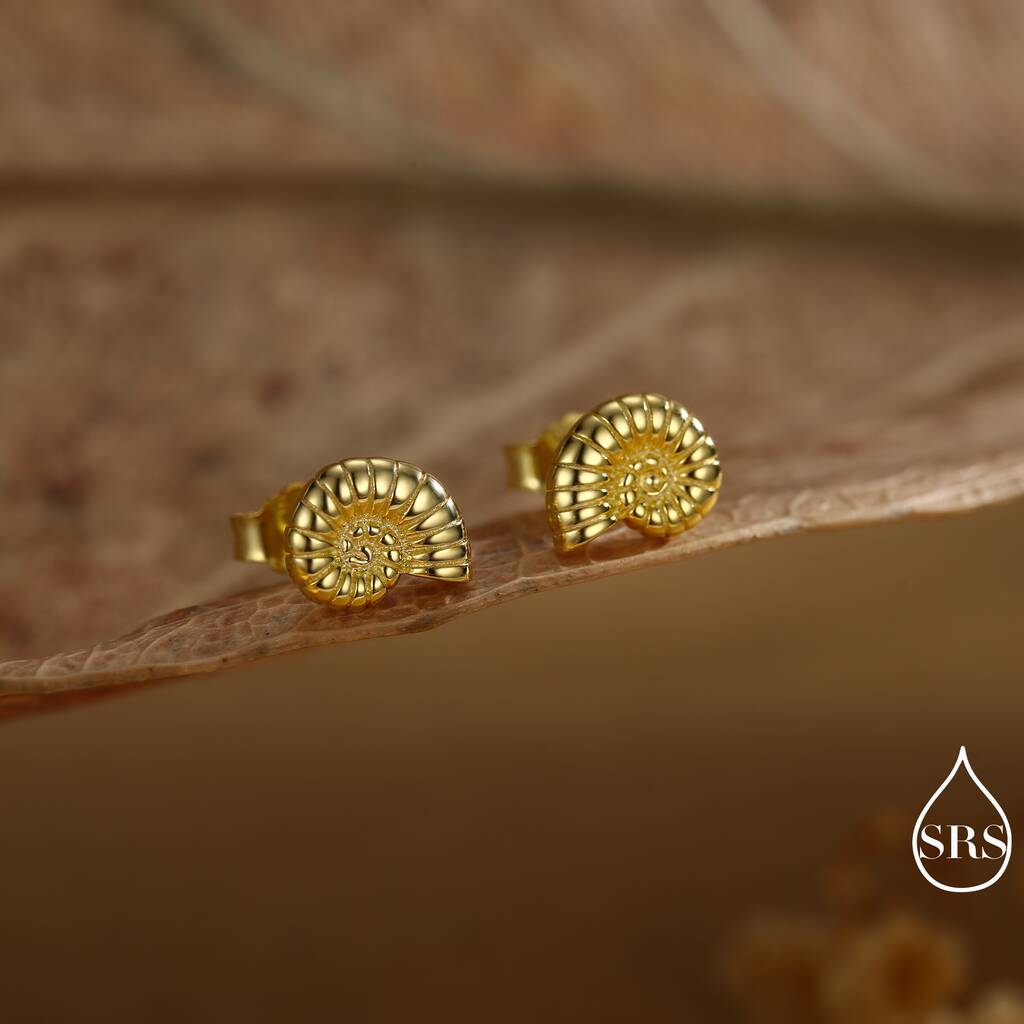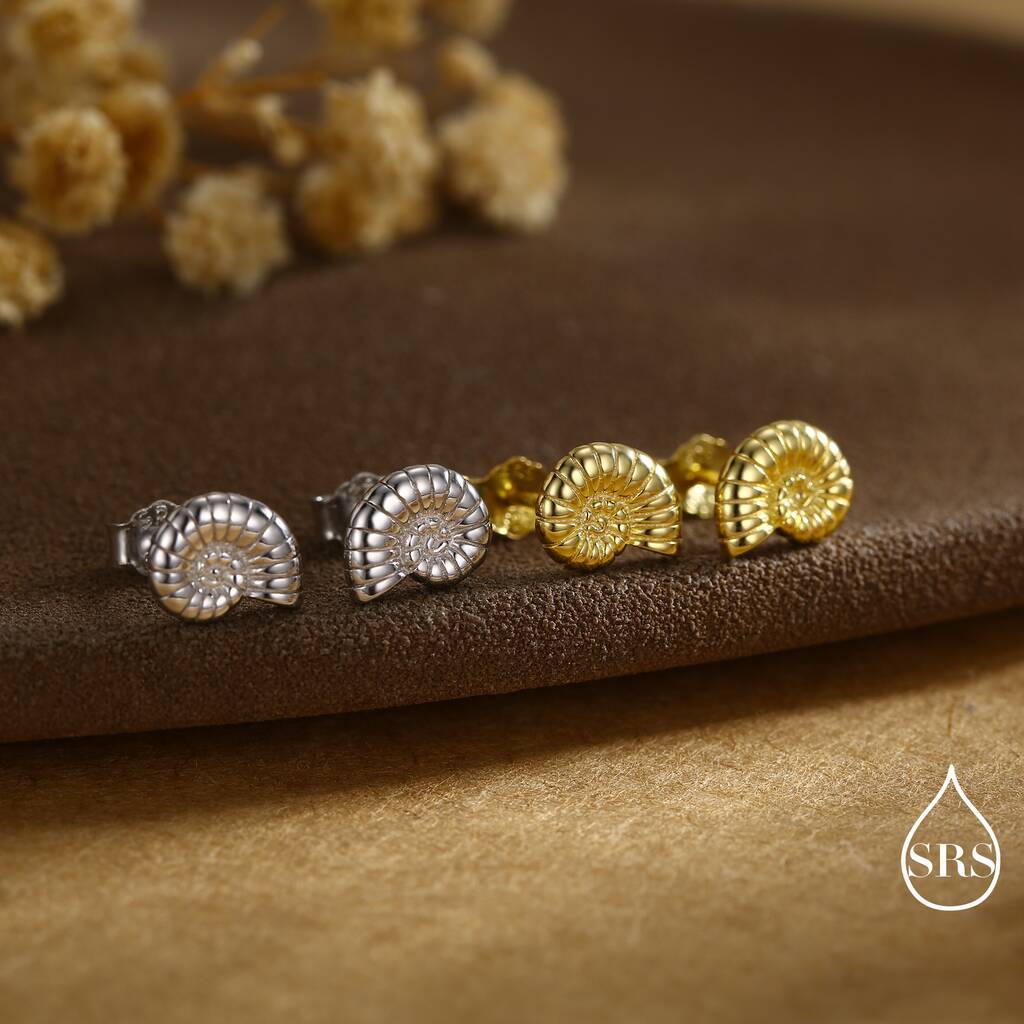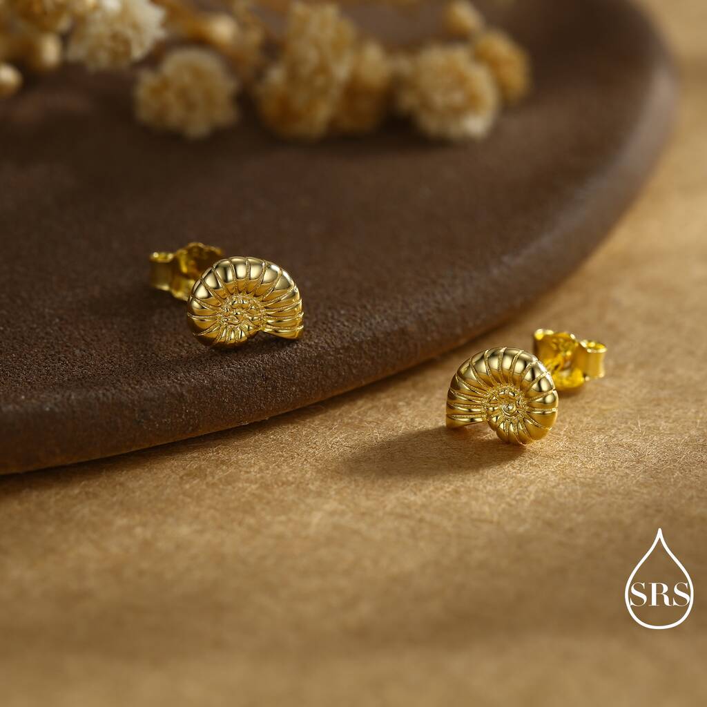 Elegant ammonite shell stud earrings. Capture the beauty of ancient-seas with a touch of timeles-elegance. Ideal for daily wear or as a unique, stylish gift.