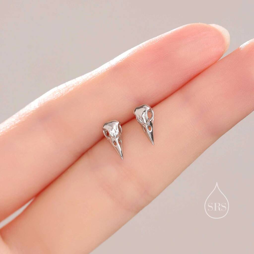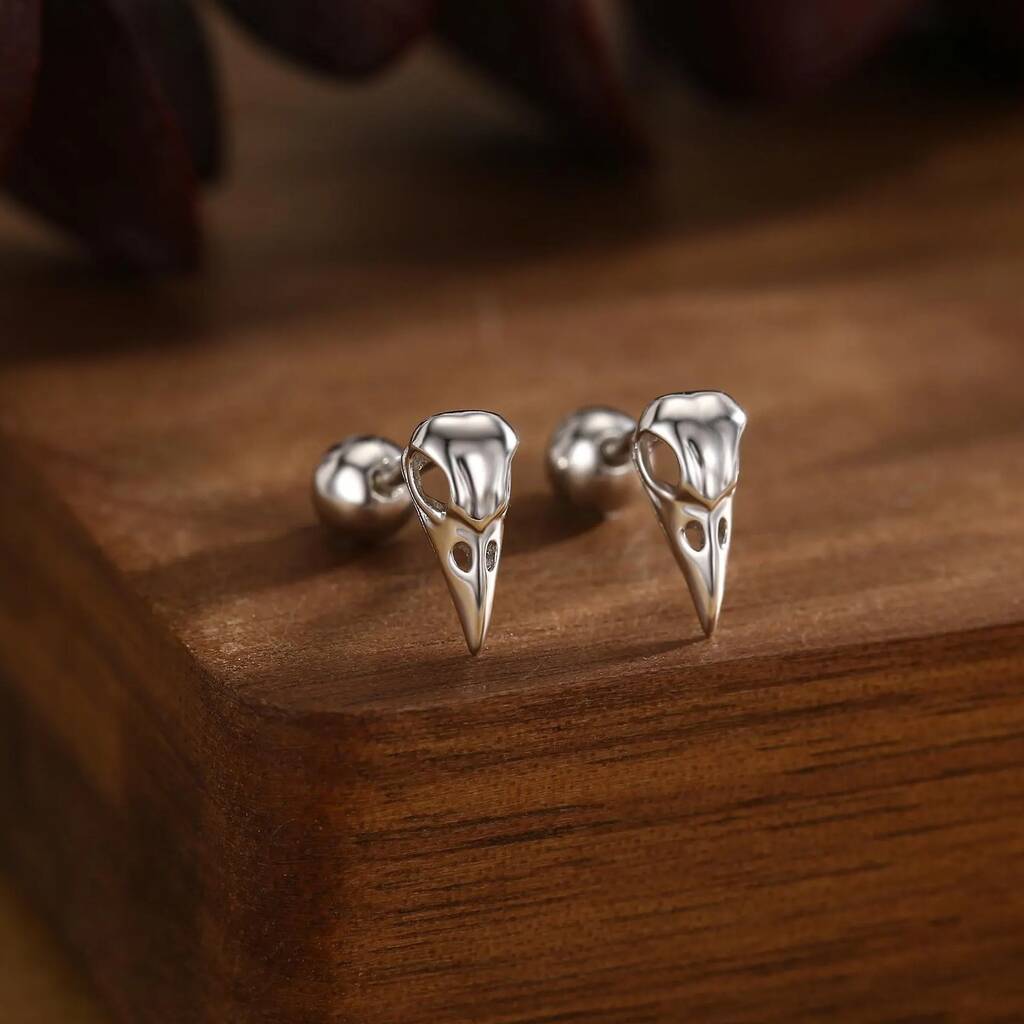 Sterling Silver Bird Skull Screw Back Earrings — edgy, gothic-inspired design, featuring detailed bird skull motifs with secure screw-back fit for bold everyday or statement-wear.