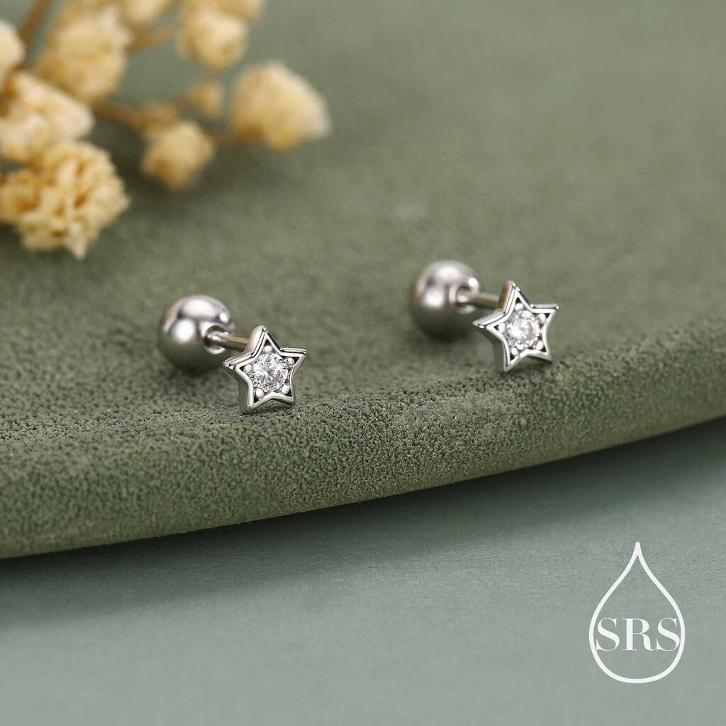 Shine bright with Sterling Silver CZ Star 18G Ball Back Screw Back Earrings—sparkling, secure, and beautifully crafted for comfortable everyday-wear with a touch of celestial-glamour.