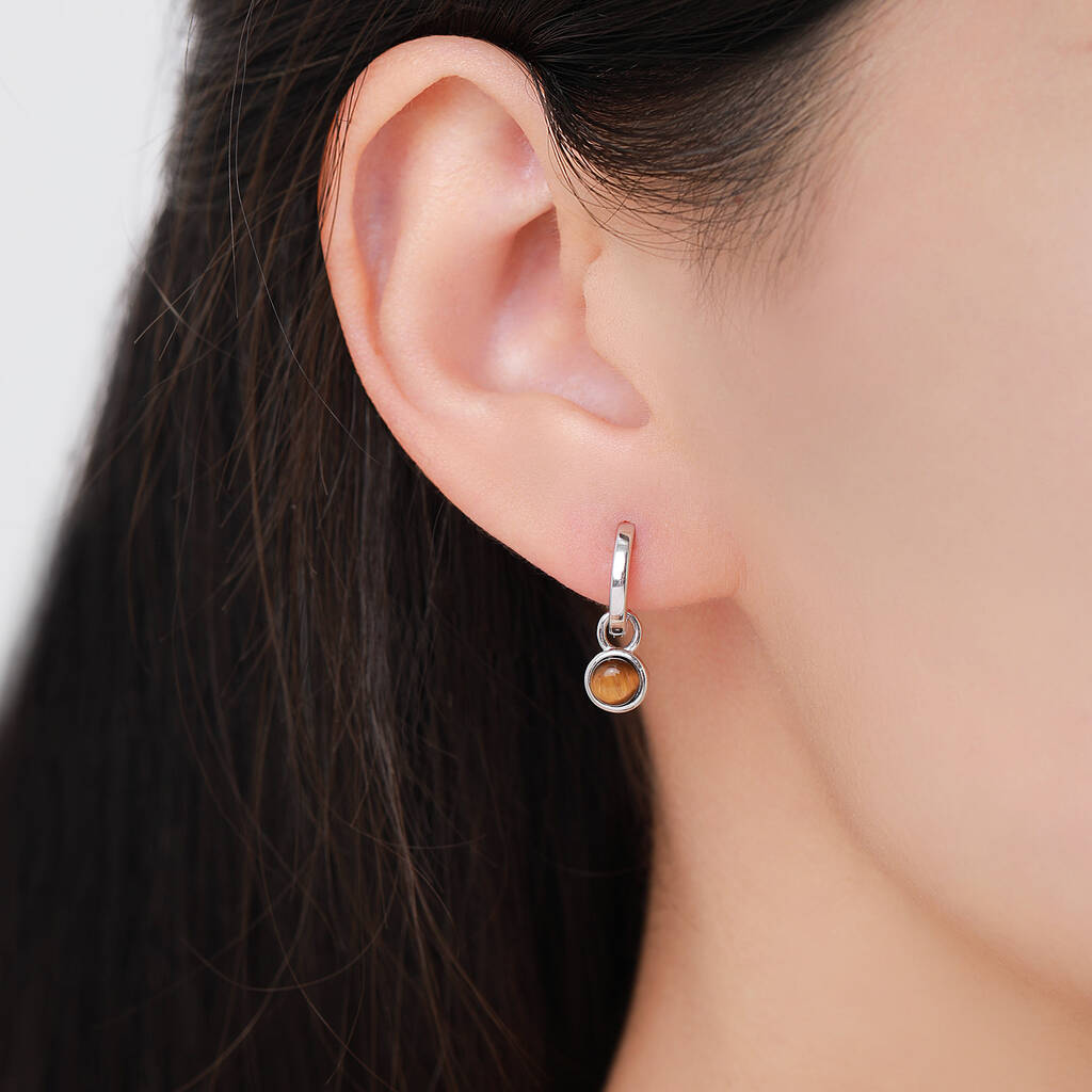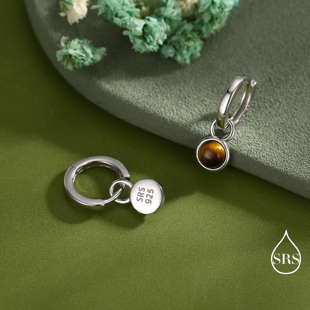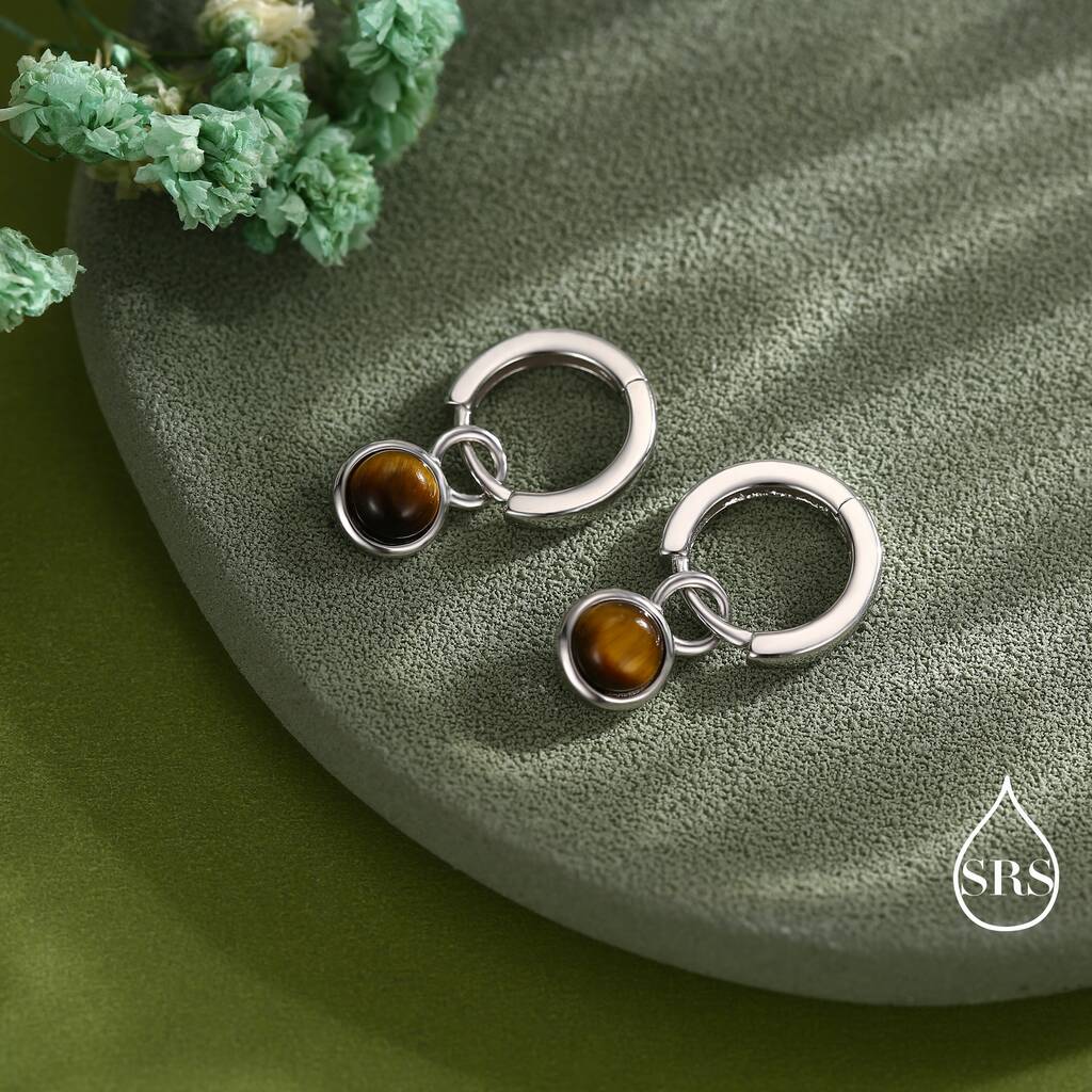 Elevate your style with our Sterling-Silver Dangling Tiger's Eye Hoop-Earrings, featuring captivating tiger's eye stones that add a touch of earthy sophistication to any ensemble.