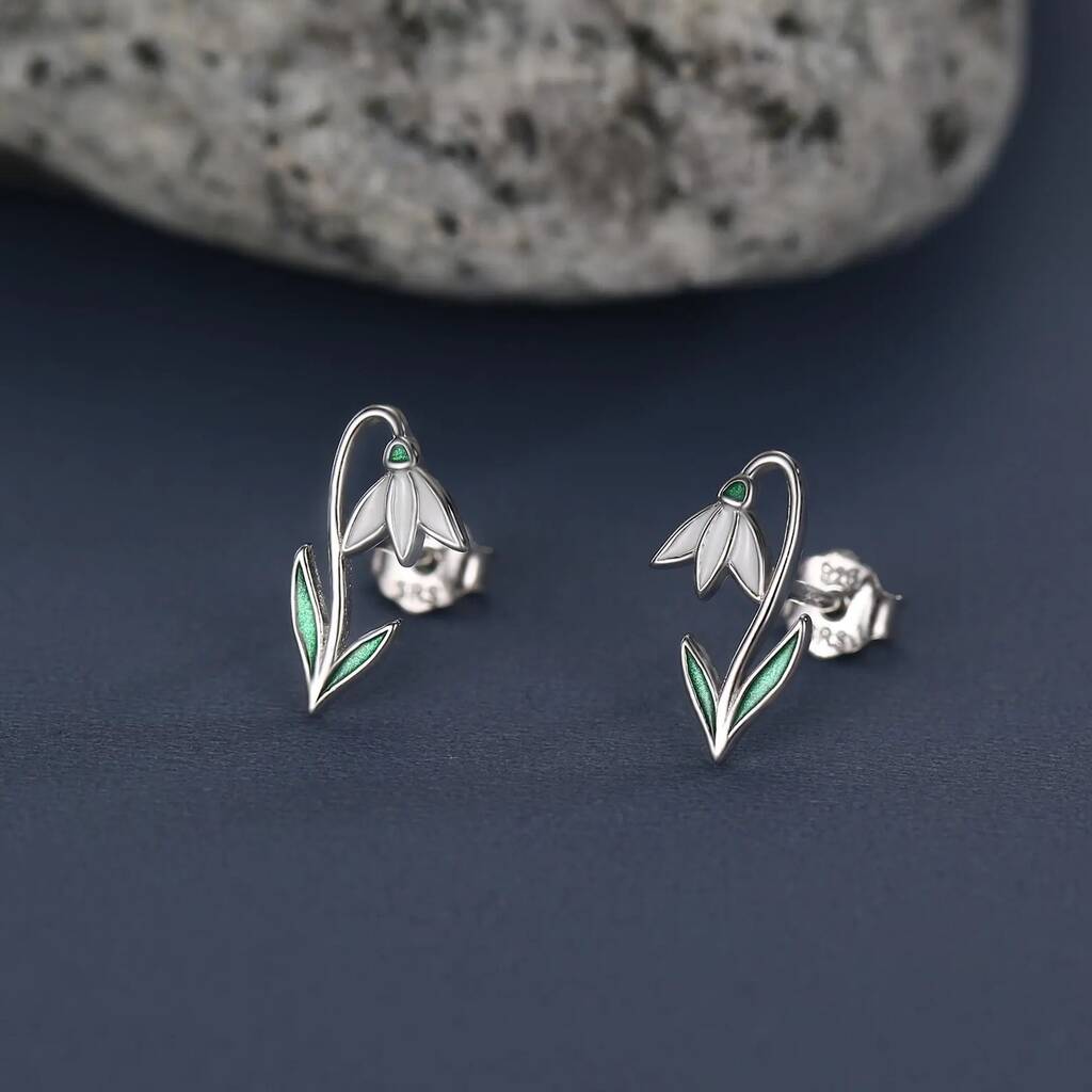 Sterling Silver Delicate Snowdrop Flower Stud Earrings With Enamel