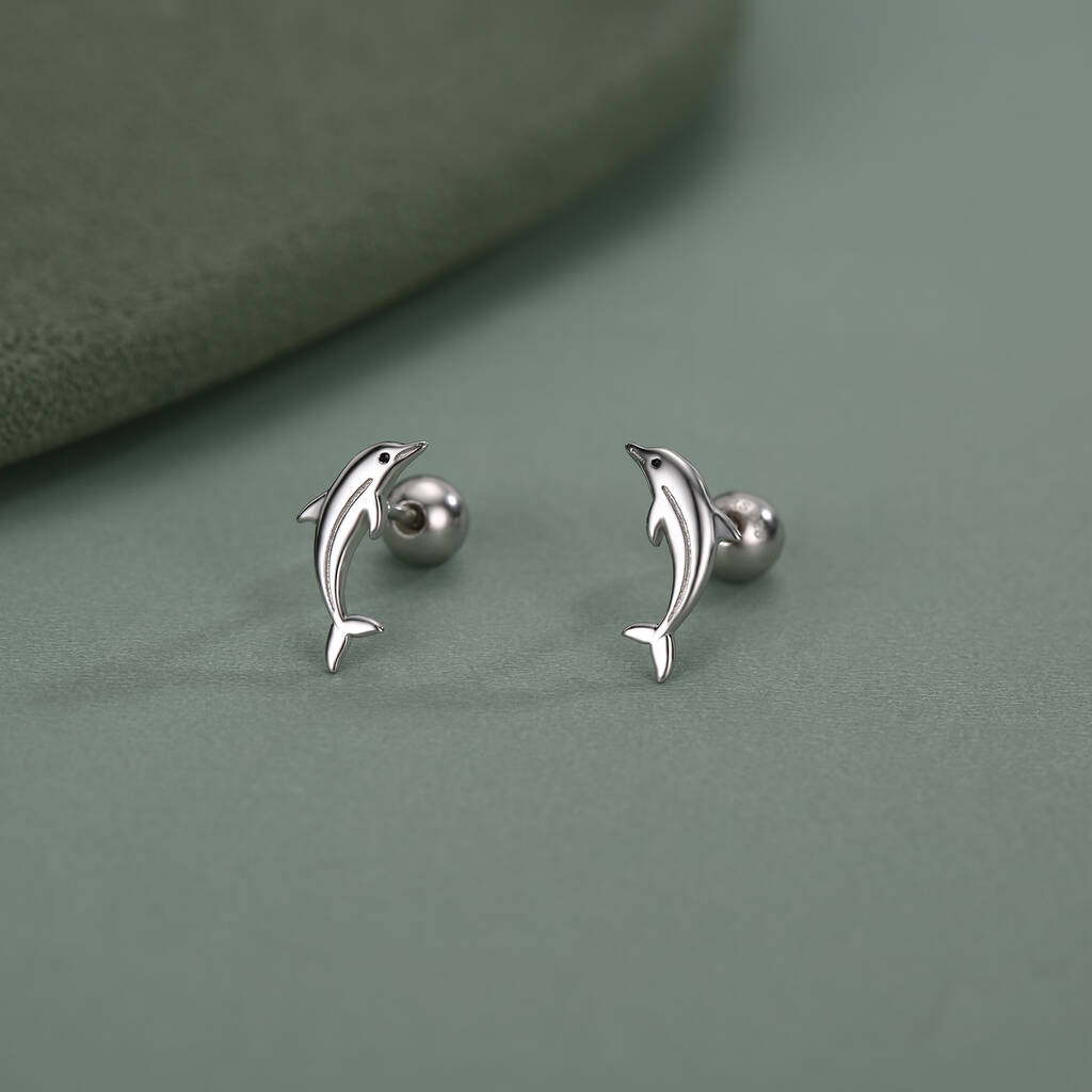 Celebrate ocean elegance with Sterling Silver Dolphin 18G Screw Back Earrings with ball backs—graceful, secure, and beautifully crafted for a charming, nature-inspired everyday look.