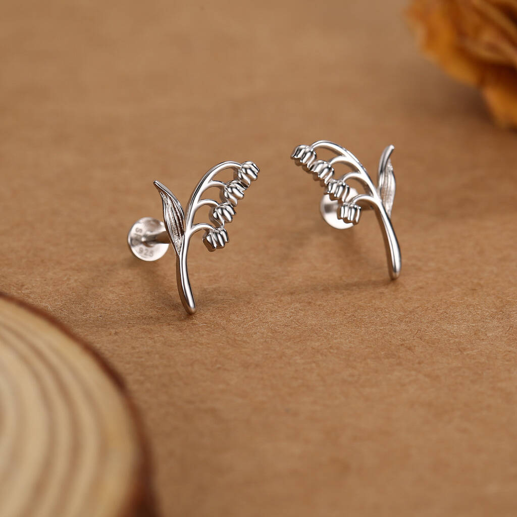Sterling silver lily of the valley flat back labret earrings feature delicate floral detail, smooth 16G posts, hypoallergenic comfort, secure fit, and timeless elegance everyday.