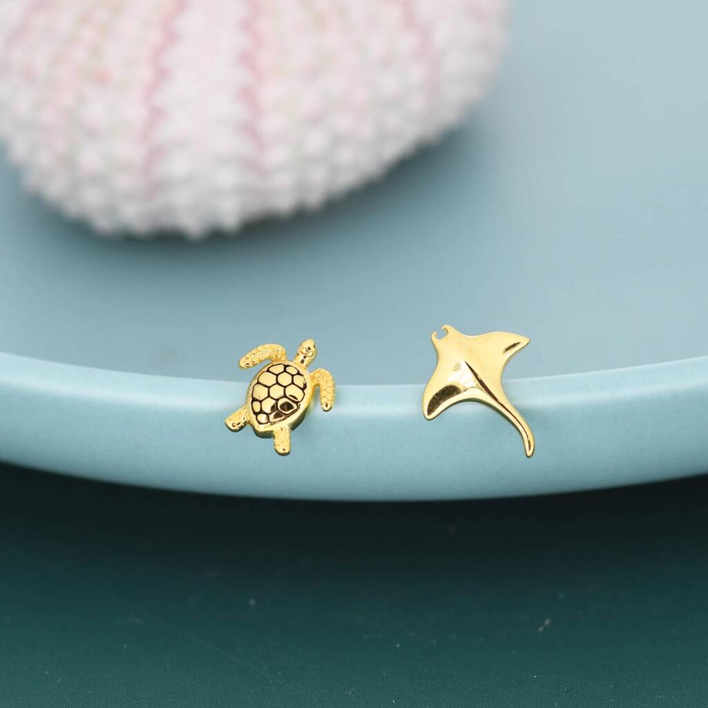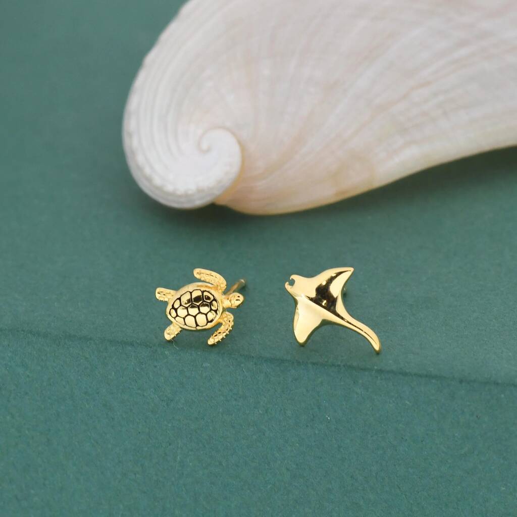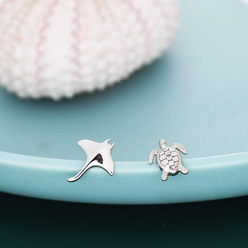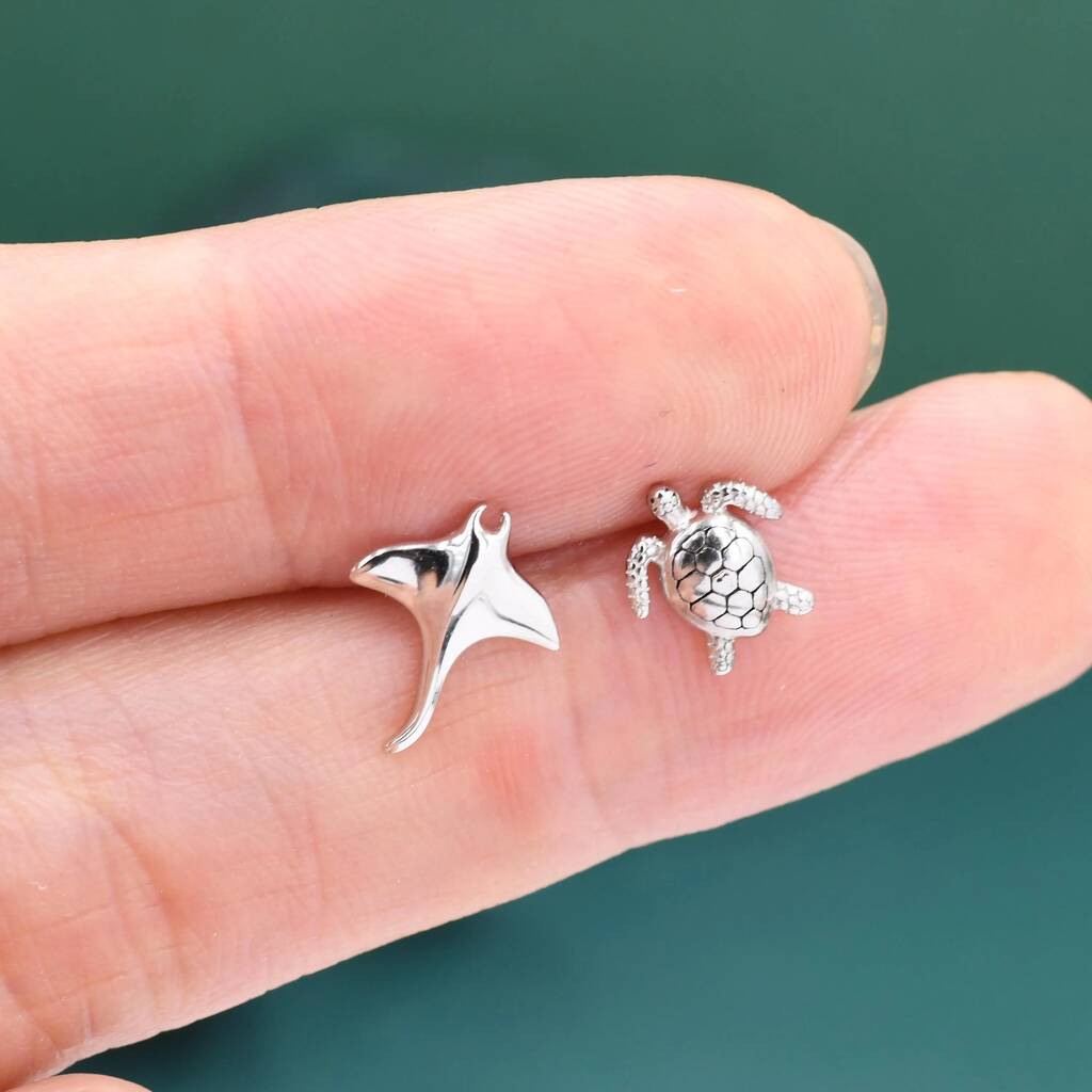 Sterling Silver Manta Ray & Sea Turtle Stud Earrings — a whimsical ocean-inspired mismatched pair, adding playful marine charm and unique style to your jewelry-collection.