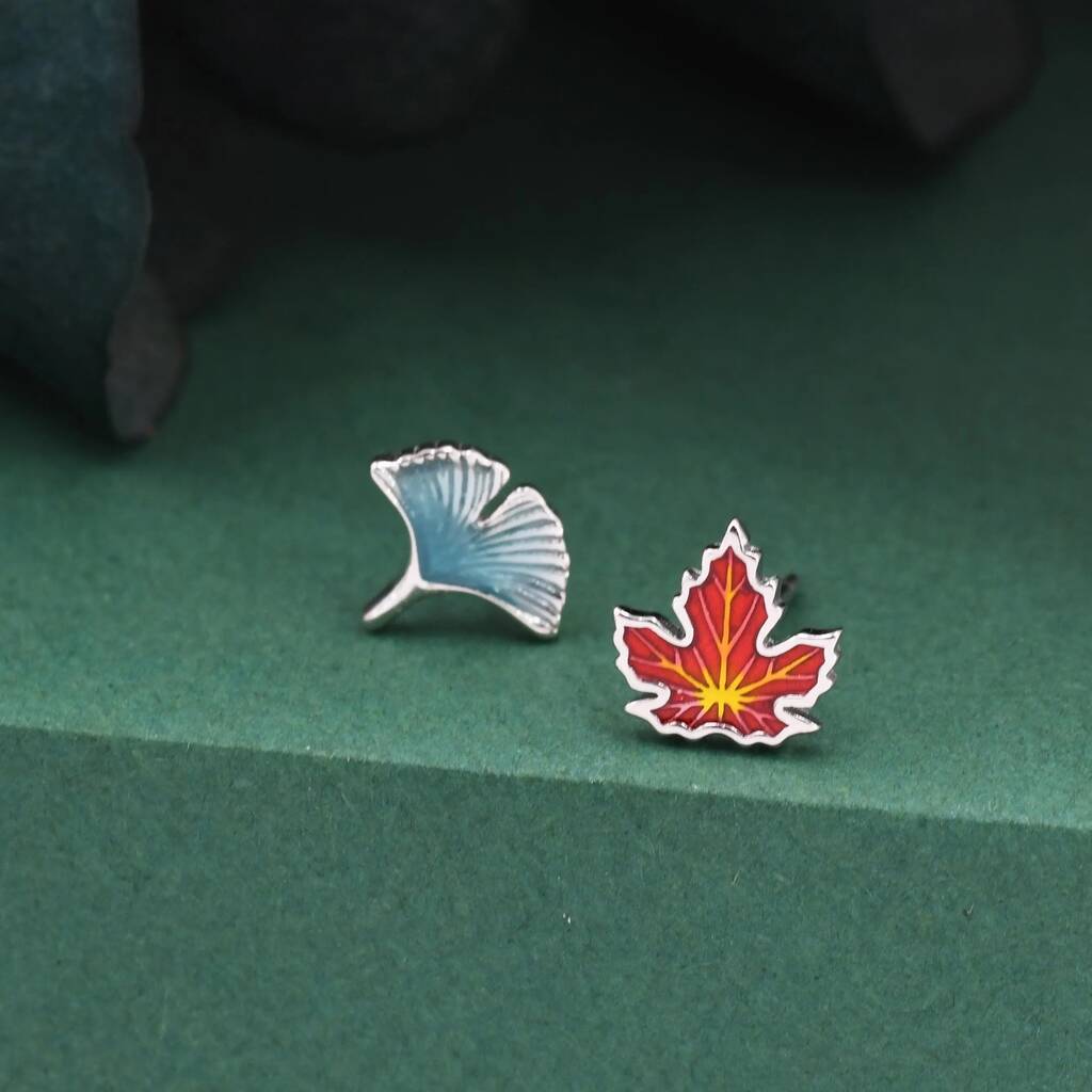 Sterling Silver Maple Leaf & Ginkgo Leaf Stud Earrings — a mismatched nature-inspired pair, adding delicate charm and seasonal elegance to your everyday jewelry collection.